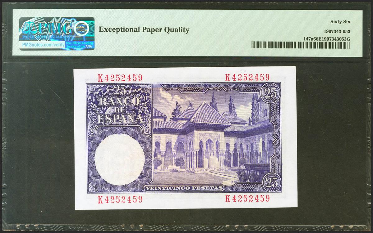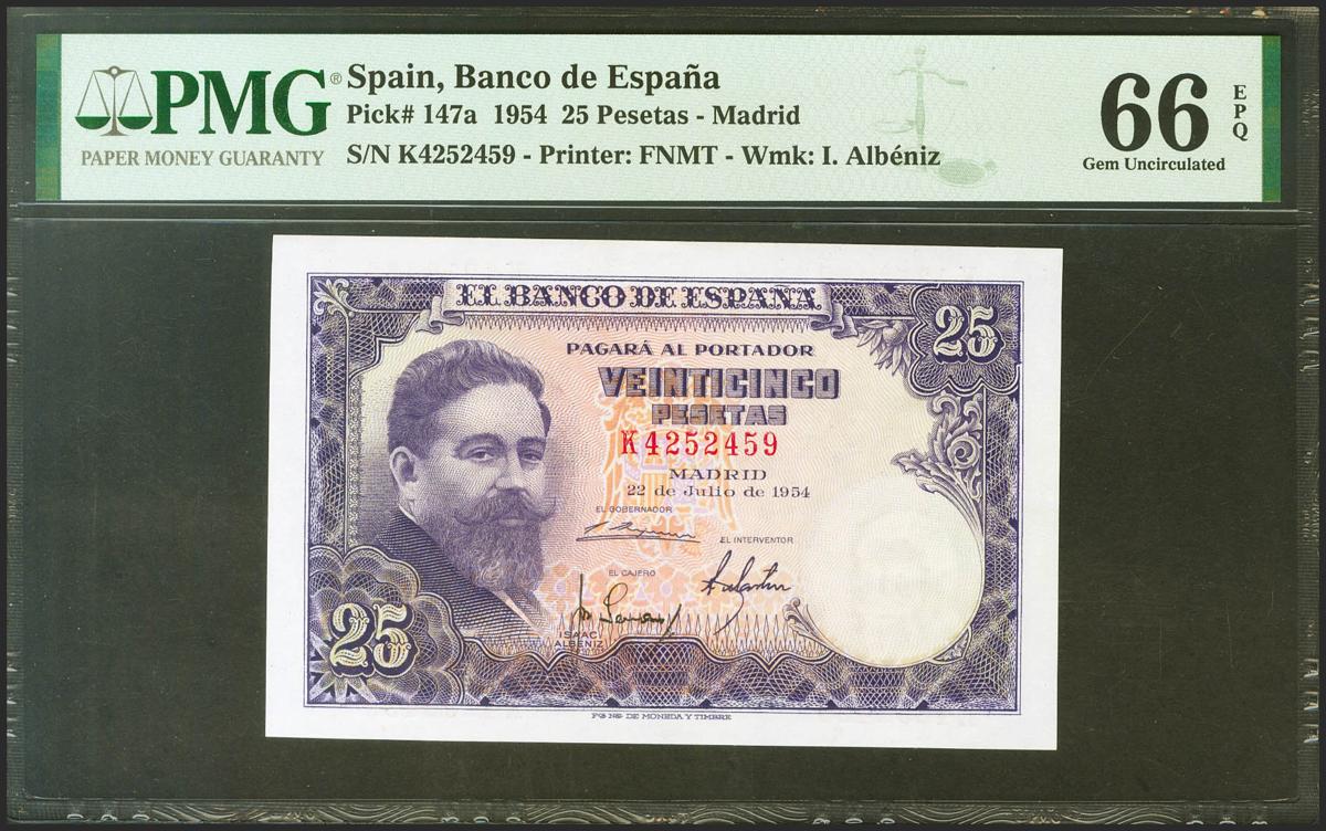 25 Pesetas. 22 de Julio de 1954. Serie K. (Edifil 2021: 467a, Pick: 147a). Inusual en esta excepcional calidad, apresto original. SC. Encapsulado PMG66EPQ.