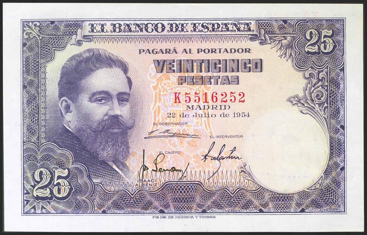 25 Pesetas. 22 de Julio de 1954. Serie K. (Edifil 2021: 467a). Conserva gran parte de su apresto original. EBC+.