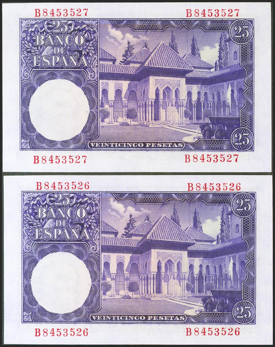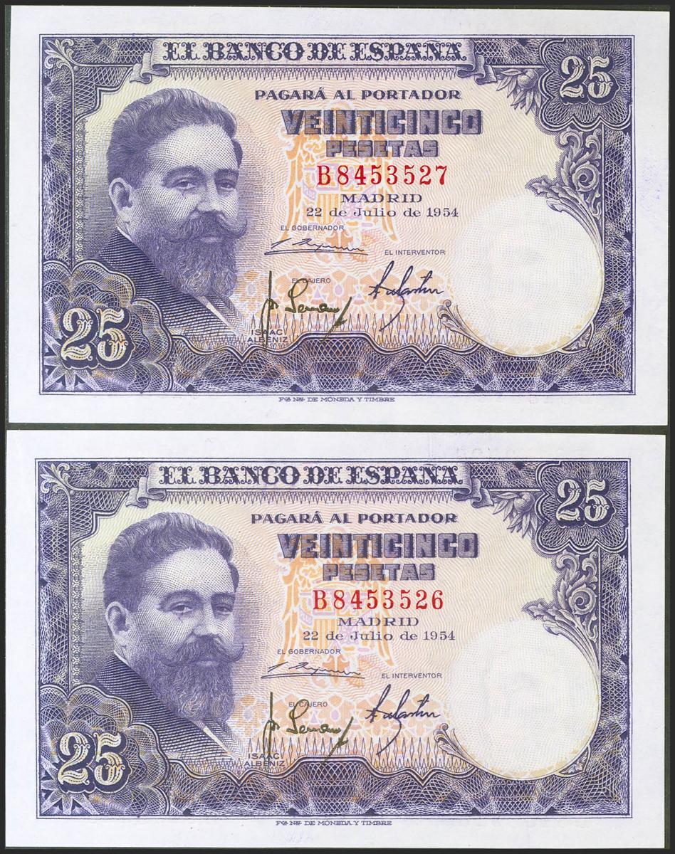 25 Pesetas. 22 de Julio de 1954. Pareja correlativa. Serie B. (Edifil 2021: 467a). Apresto original. SC.