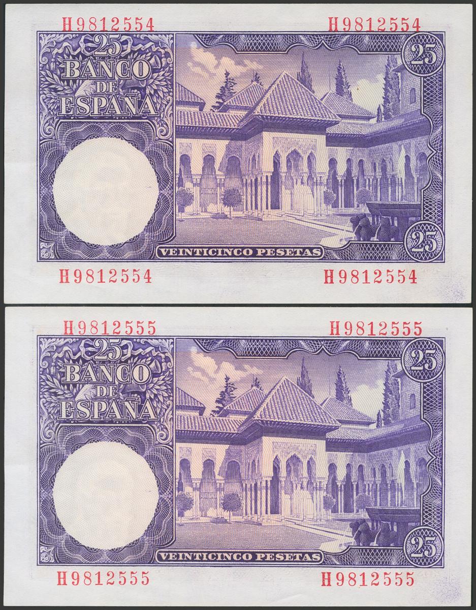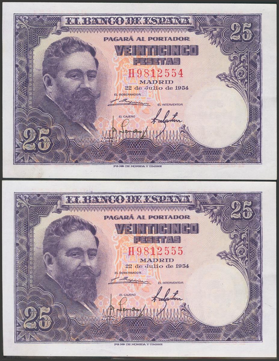 25 Pesetas. 22 de Julio de 1954. Pareja correlativa. Serie H. (Edifil 2017: 467a). Conserva todo su apresto original. SC-.