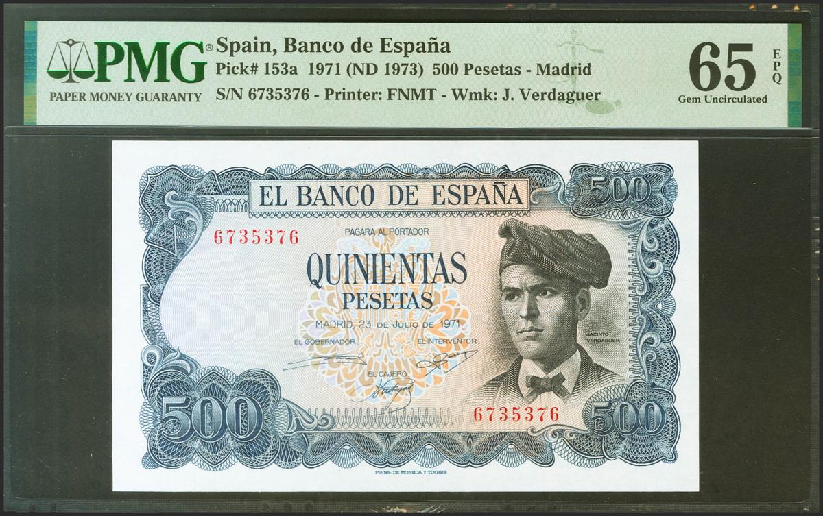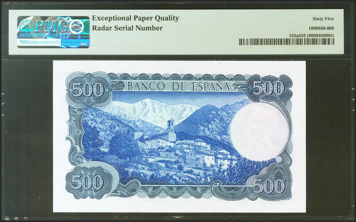 500 Pesetas. 23 de Julio de 1971. Sin serie. (Edifil 2021: 473, Pick: 153a). Raro en esta calidad, apresto original. SC. Encapsulado PMG65EPQ.