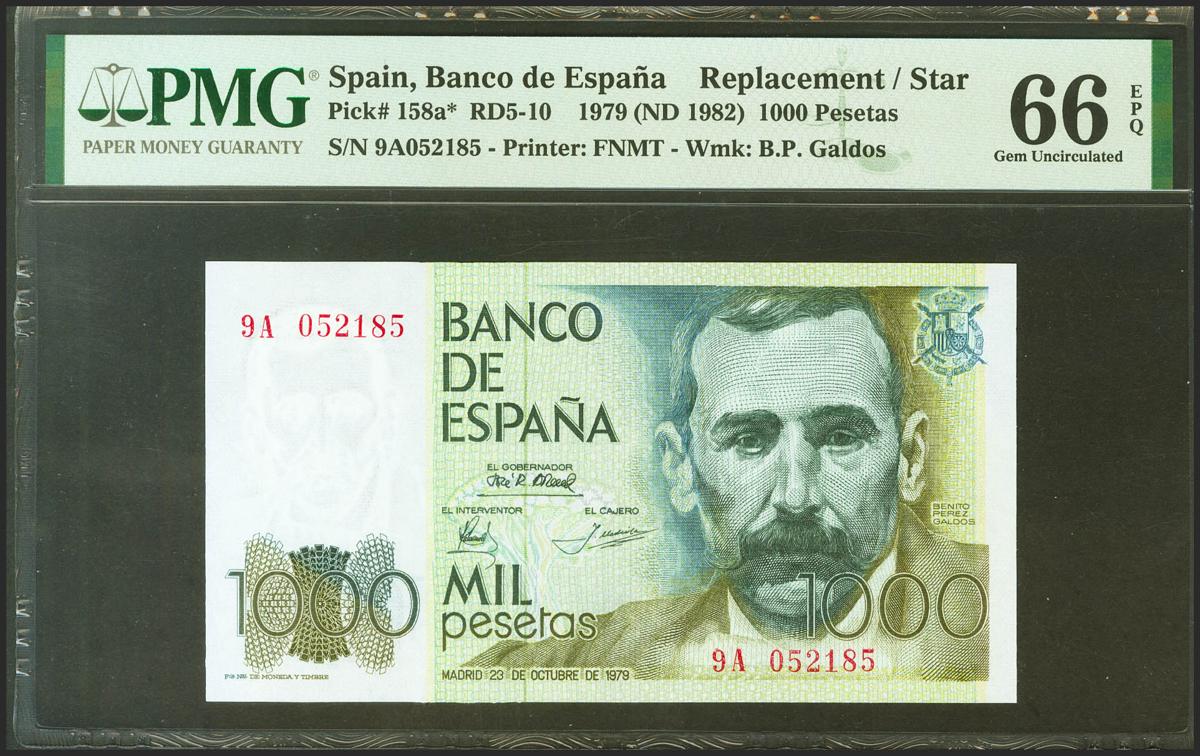 1000 Pesetas. 23 de Octubre de 1979. Serie especial 9A. (Edifil 2021: 477b, Pick: 158a*). Inusual en esta excepcional calidad, apresto original. SC. Encapsulado PMG66EPQ.