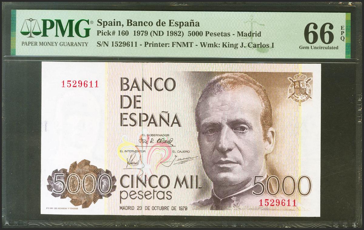 5000 Pesetas. 23 de Octubre de 1979. Sin serie. (Edifil 2021: 478, Pick: 160). Inusual en esta excepcional calidad, apresto original. SC. Encapsulado PMG66EPQ.