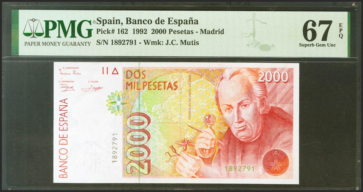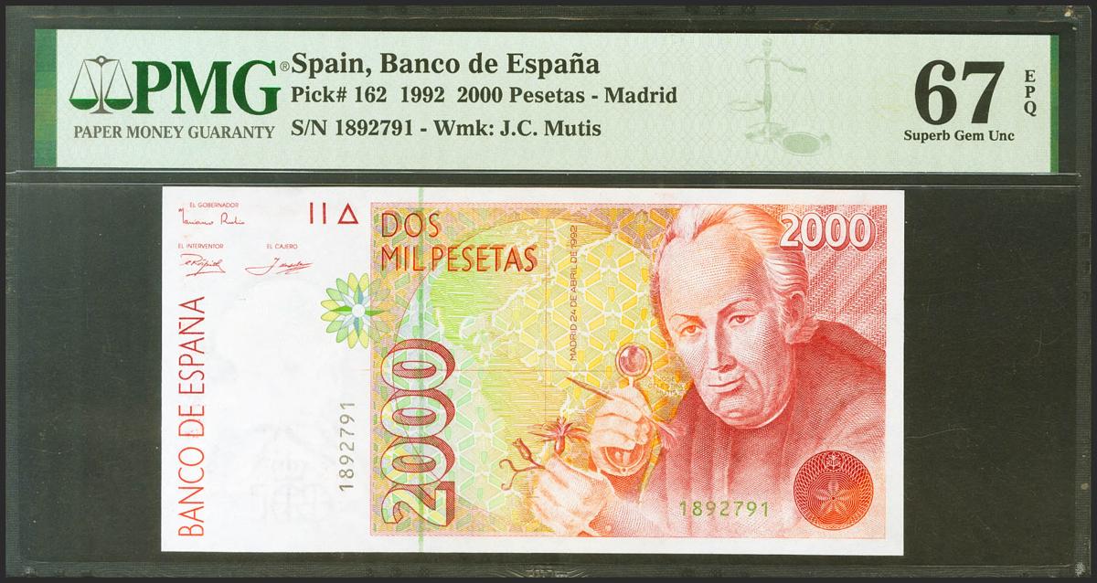2000 Pesetas. 24 de Abril de 1992. Sin serie. (Edifil 2021: 482, Pick: 162). Raro en esta excepcional calidad, apresto original. SC. Encapsulado PMG67EPQ.
