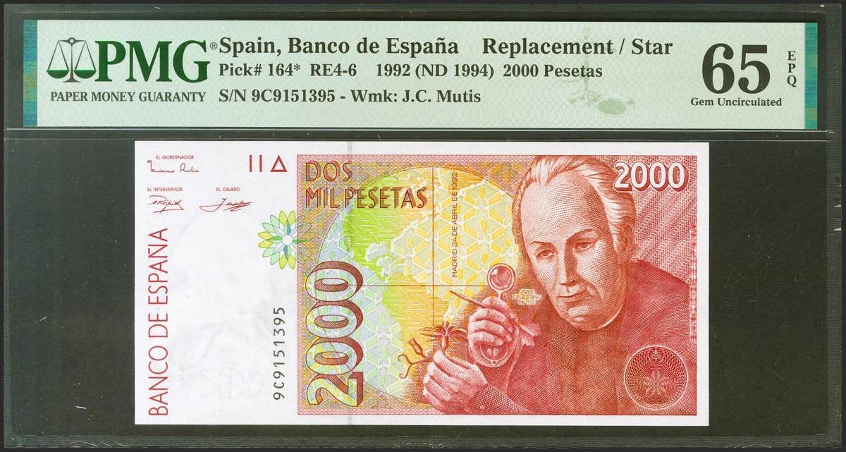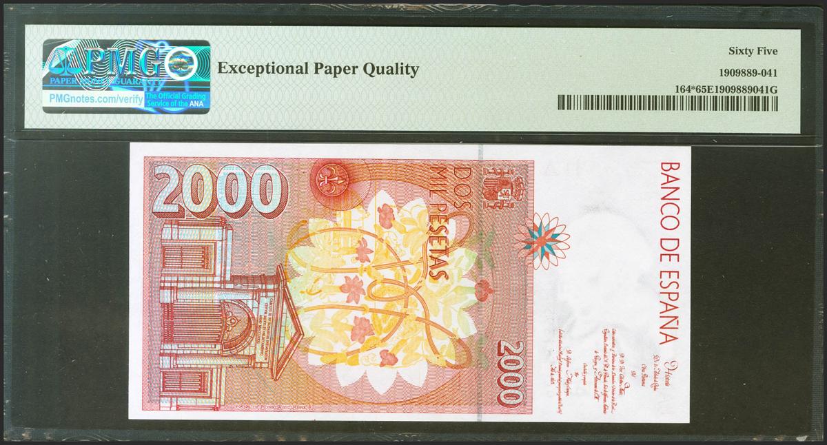 2000 Pesetas. 24 de Abril de 1992. Serie especial 9C. (Edifil 2021: 482Ab, Pick: 164*). Raro en esta calidad, apresto original. SC. Encapsulado PMG65EPQ.