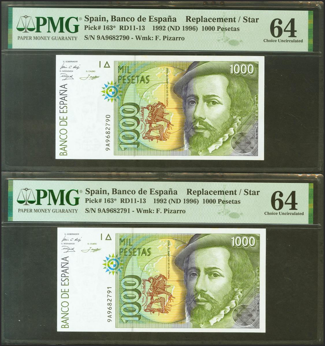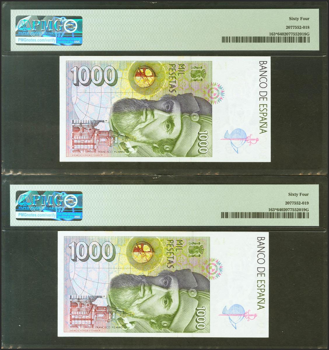 1000 Pesetas. 12 de Octubre de 1992. Pareja correlativa. Serie especial 9A. (Edifil 2021: 483c, Pick: 163*). SC. Encapsulados PMG64, ambos.