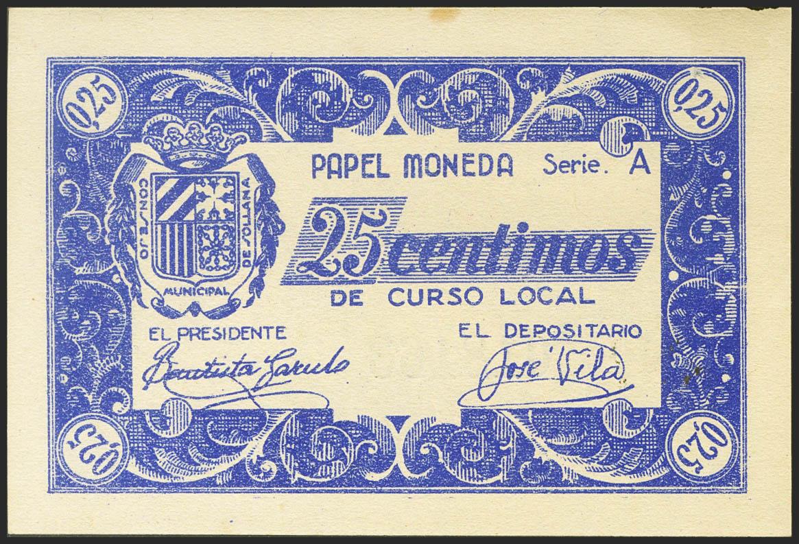 SOLLANA (VALENCIA). 25 Céntimos. (1937ca). Serie A. (González: 4896). EBC.