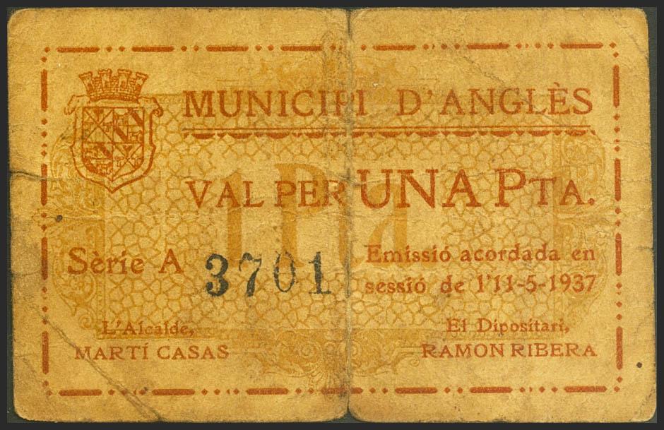 ANGLES (GERONA). 1 Peseta. 11 de Mayo de 1937. Serie A. (González: 6288). Inusual. BC-.