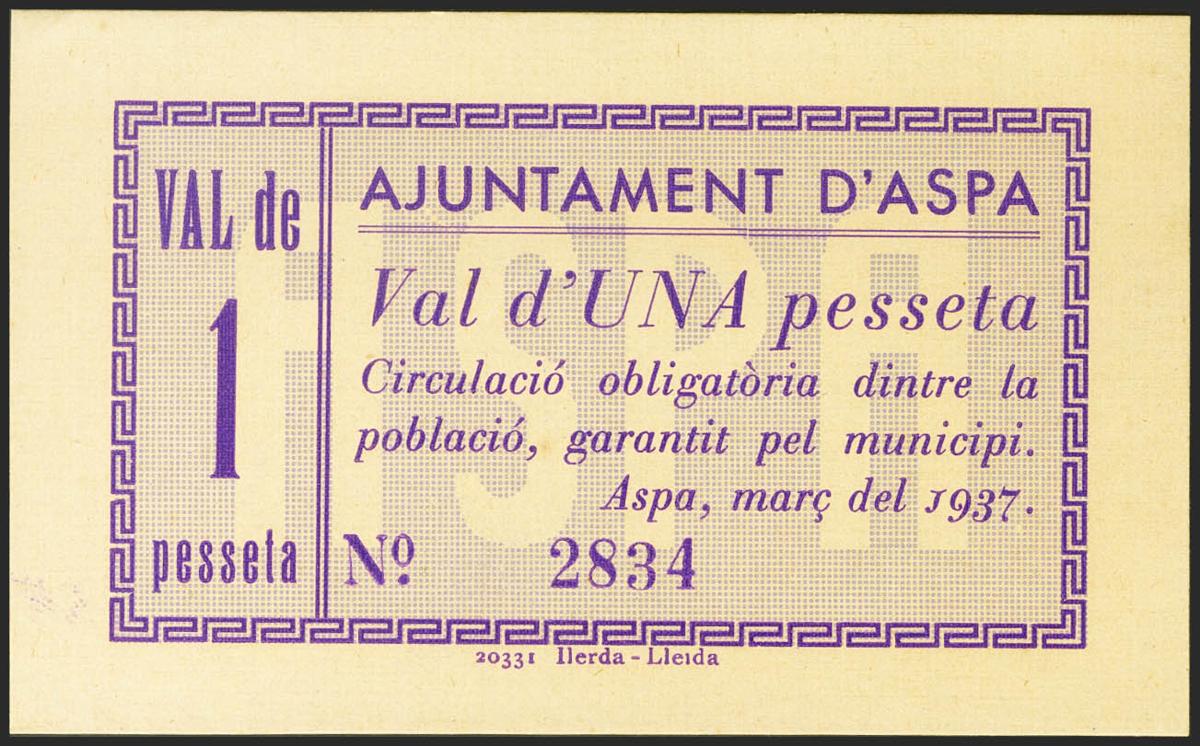ASPA (LERIDA). 1 Peseta. Marzo 1937. (González: 6440). Raro. SC-.