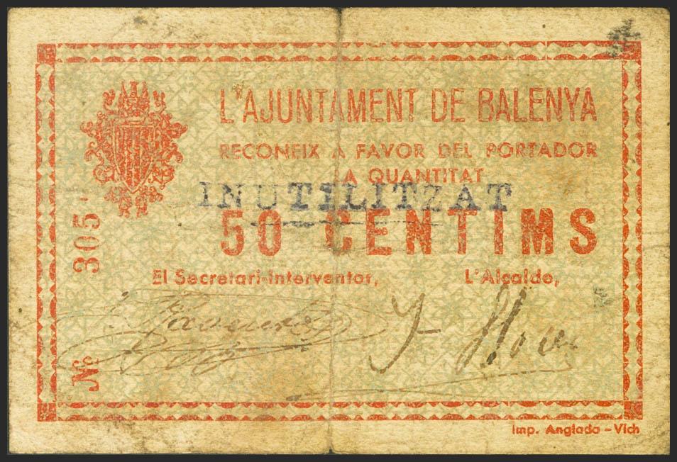 BALENYA (BARCELONA). 50 Céntimos. (1937ca). Sobrecarga "INUTILIZAT". (González: 6493a). Inusual. BC.