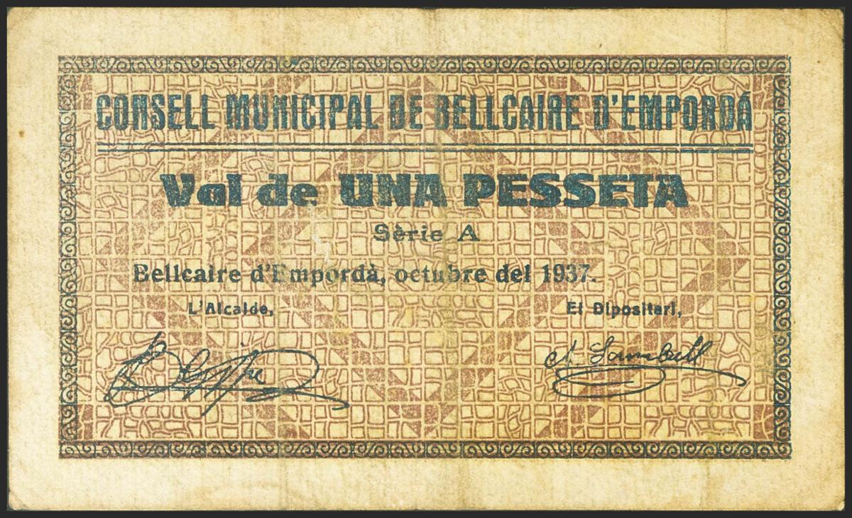 BELCAIRE D´EMPORDA (GERONA). 1 Peseta. Octubre 1937. Serie A. (González: 6963). MBC.