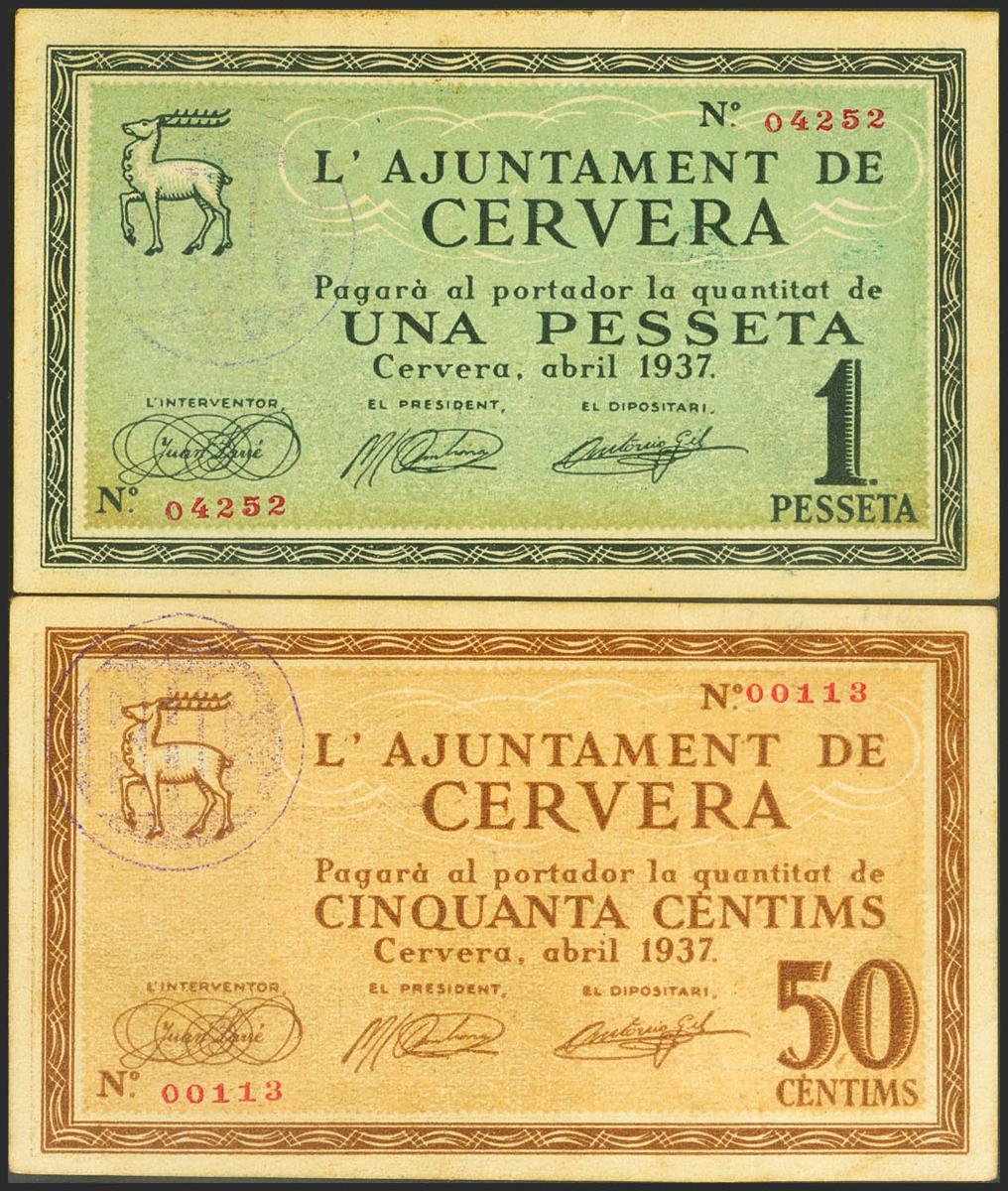 CERVERA (LERIDA). 50 Céntimos y 1 Peseta. Abril 1937. (González: 7556/57). Serie completa. EBC+.