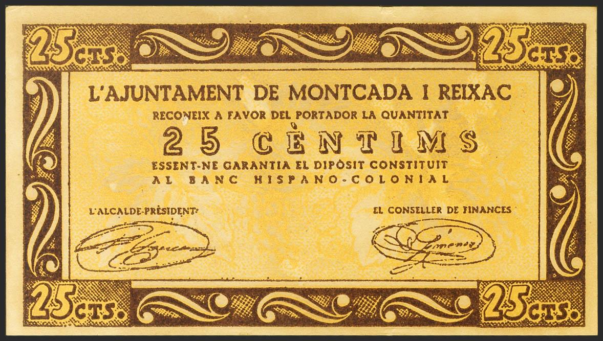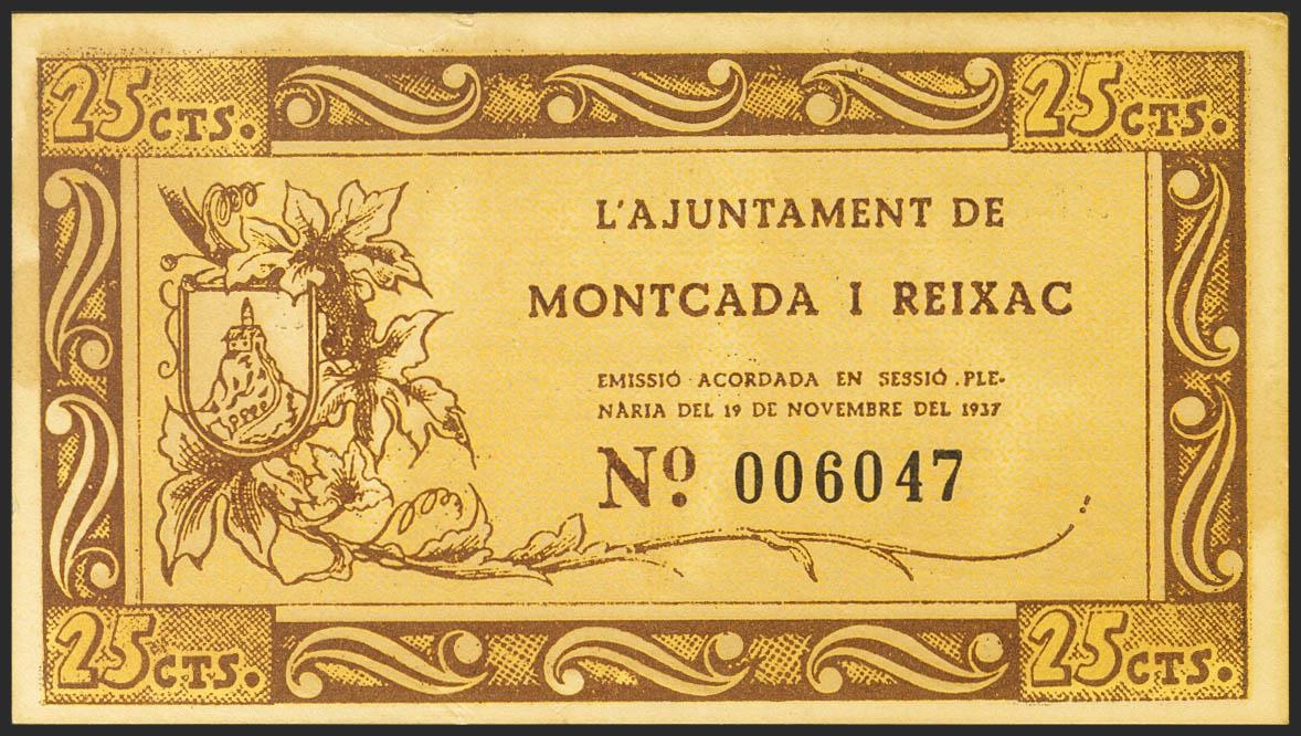 MONTCADA I REIXAC (BARCELONA). 25 Céntimos. 19 de Noviembre de 1937. (González: 8776). SC-.