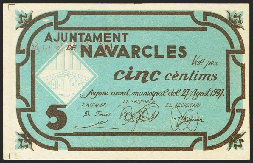 NAVARCLES (BARCELONA). 5 Céntimos. 27 de Agosto de 1937. (González: 8878). SC-.