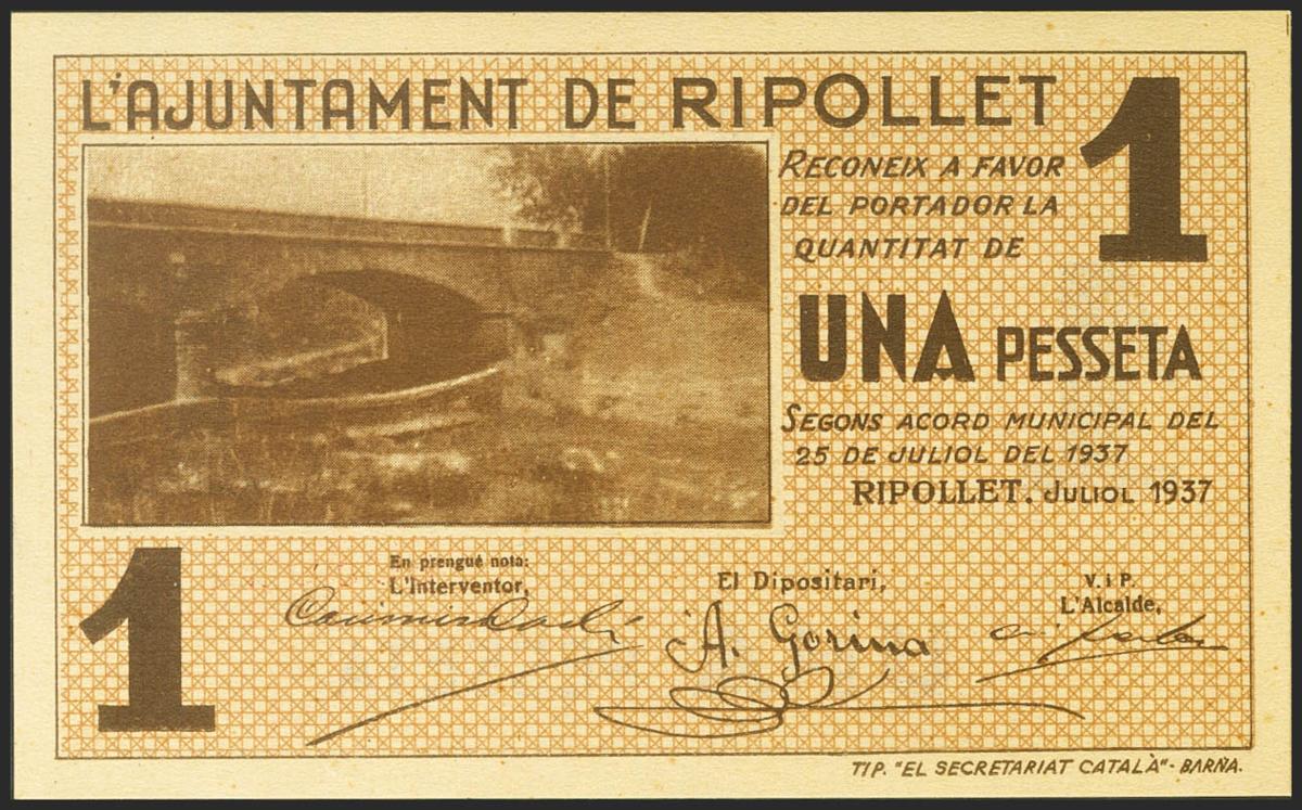 RIPOLLET (BARCELONA). 1 Peseta. 25 de Julio de 1937. (González: 9668). SC.
