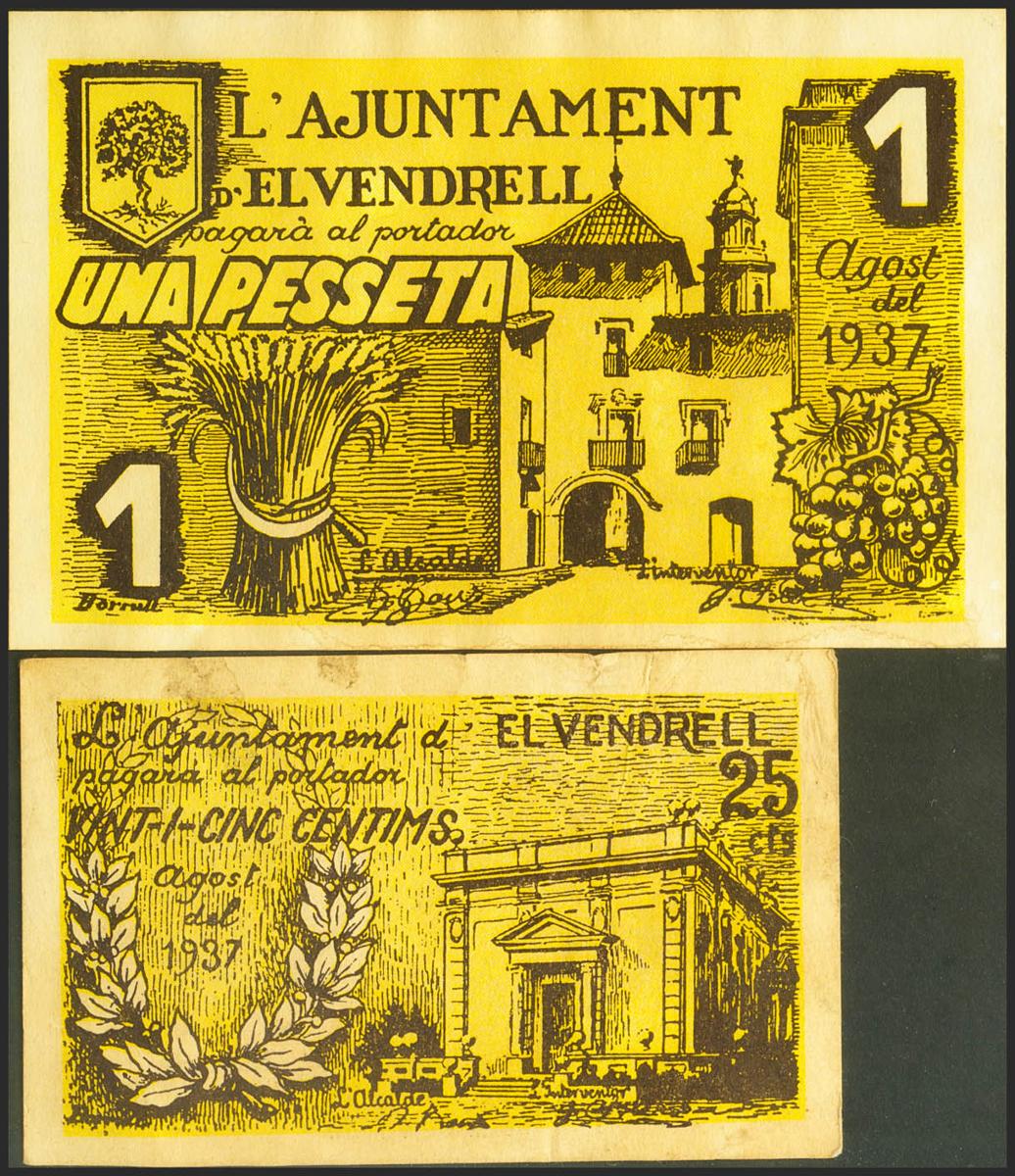 EL VENDRELL (TARRAGONA). 25 Céntimos y 1 Peseta. Agosto 1937. (González: 10599/00). Serie completa. EBC.