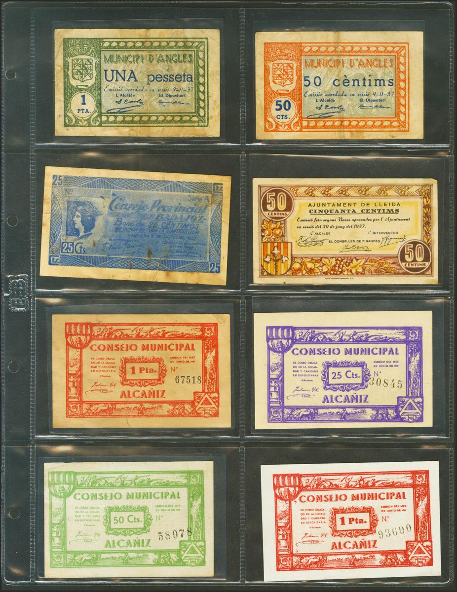 Conjunto de 41 billetes y dos monedas cartón de la Guerra Civil de diferentes localidades y en diversas calidades, alguno de ellos fantasías. SC-/RC. A EXAMINAR.
