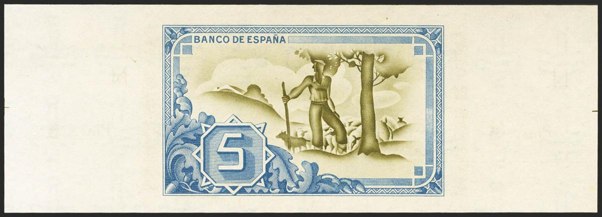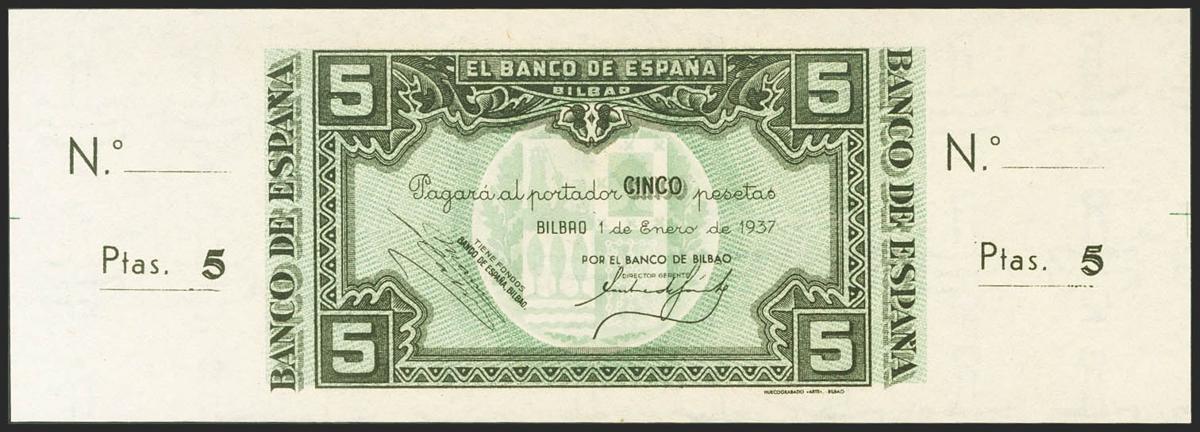 5 Pesetas. 1 de Enero de 1937. Sucursal de Bilbao, antefirma Banco de Bilbao. Sin serie y sin numeración, con ambas matrices. (Edifil 2021: 385c). Apresto original. SC.