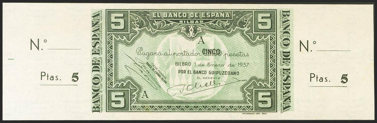 5 Pesetas. 1 de Enero de 1937. Sucursal de Bilbao, antefirma Banco Guipuzcoano. Serie A y sin numeración, con ambas matrices. (Edifil 2021: 386c). Apresto original. SC-.
