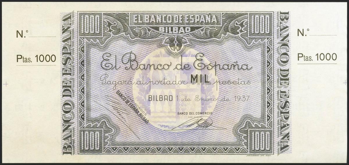 1000 Pesetas. 1 de Enero de 1937. Sucursal de Bilbao, antefirma Banco del Comercio. No emitido, sin serie y sin numeración, con ambas matrices. (Edifil 2021: NE27c). Apresto original. SC-.