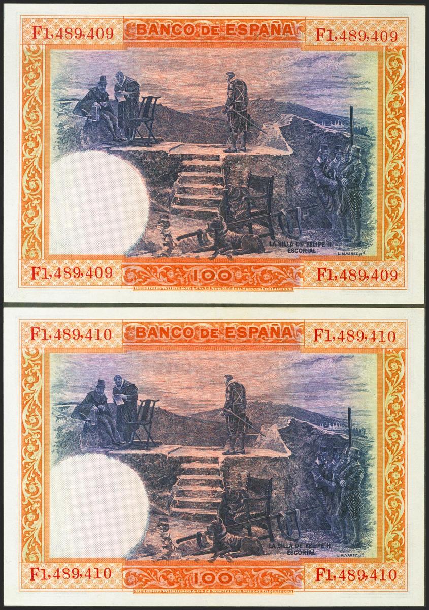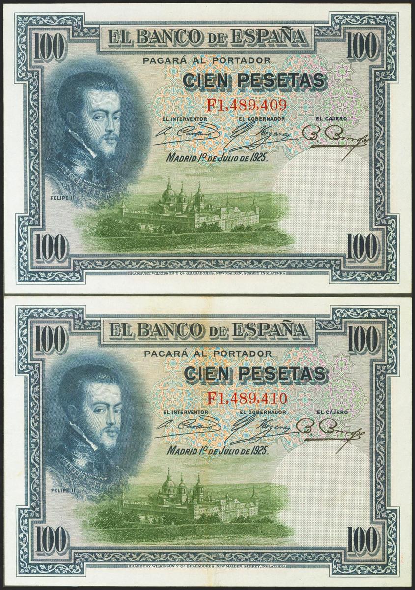 100 pesetas. July 1, 1925. Correlative couple. Series F. (Edifil 2021: 350). Extremely Fine.