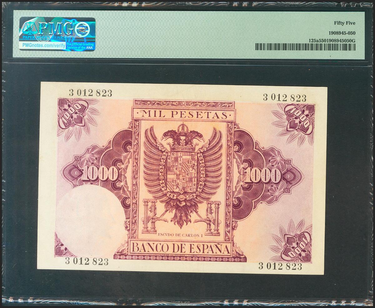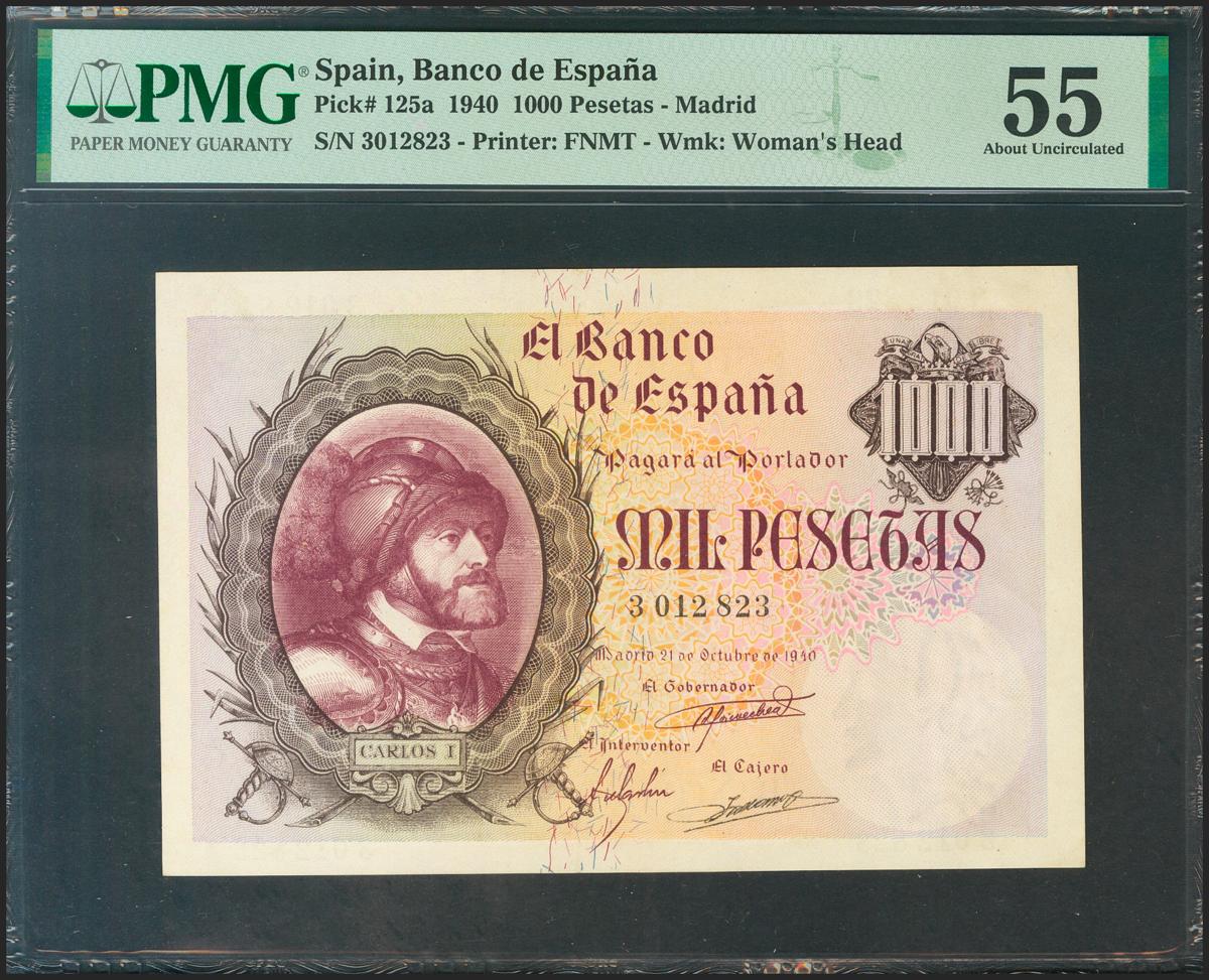 English 1000 Pesetas. October 21, 1940. No series. (Edifil 2021: 445, Pick: 125a). Very rare in this quality. Good Extremely Fine. PMG55 encapsulation.