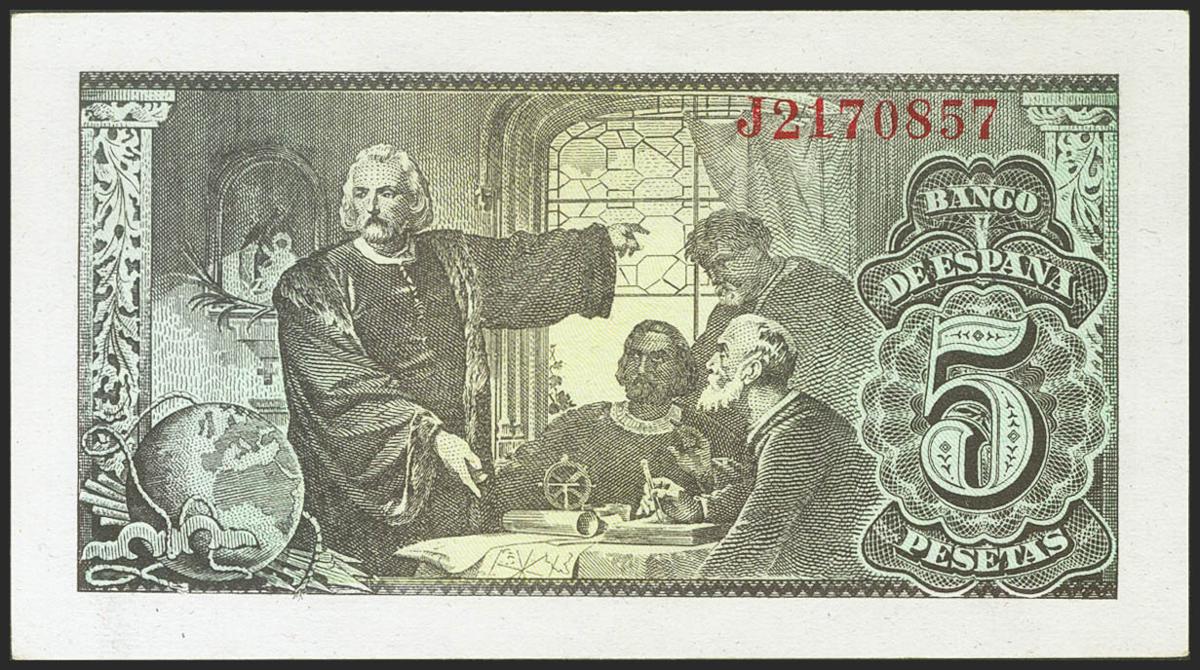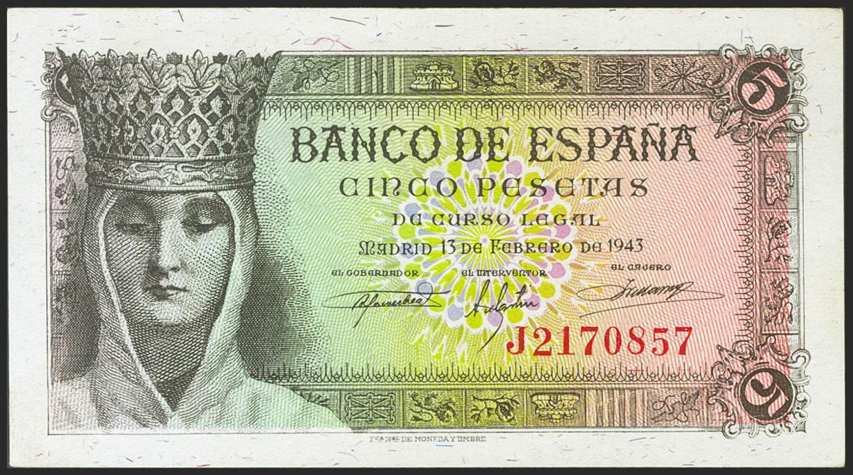 5 pesetas. February 13, 1943. Series J. (Edifil 2021: 446a). Original sizing. Almost Uncirculated.