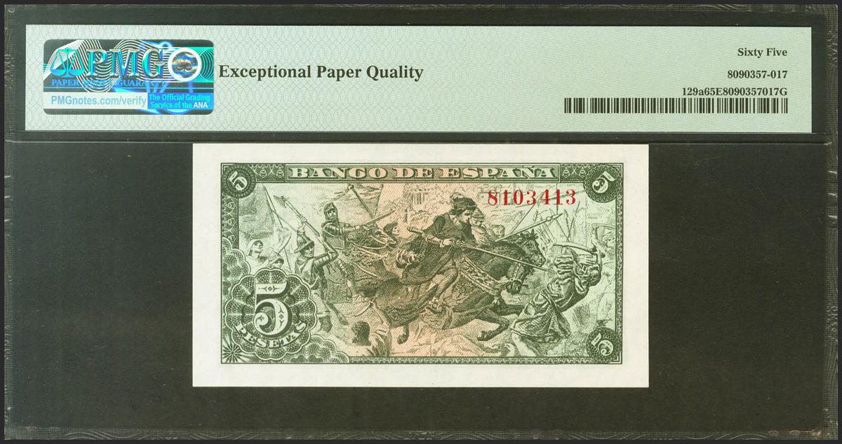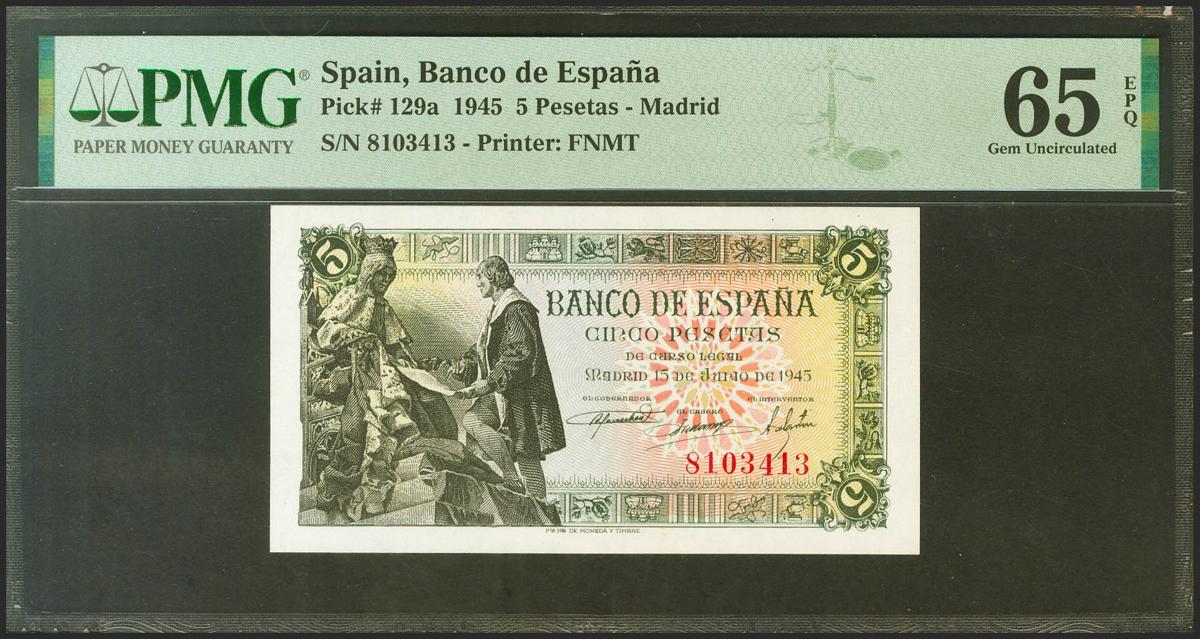 English 5 pesetas. June 15, 1945. No series. (Edifil 2021: 449, Pick: 129a). Unusual in this exceptional quality, original sizing. Uncirculated. PMG65EPQ package.