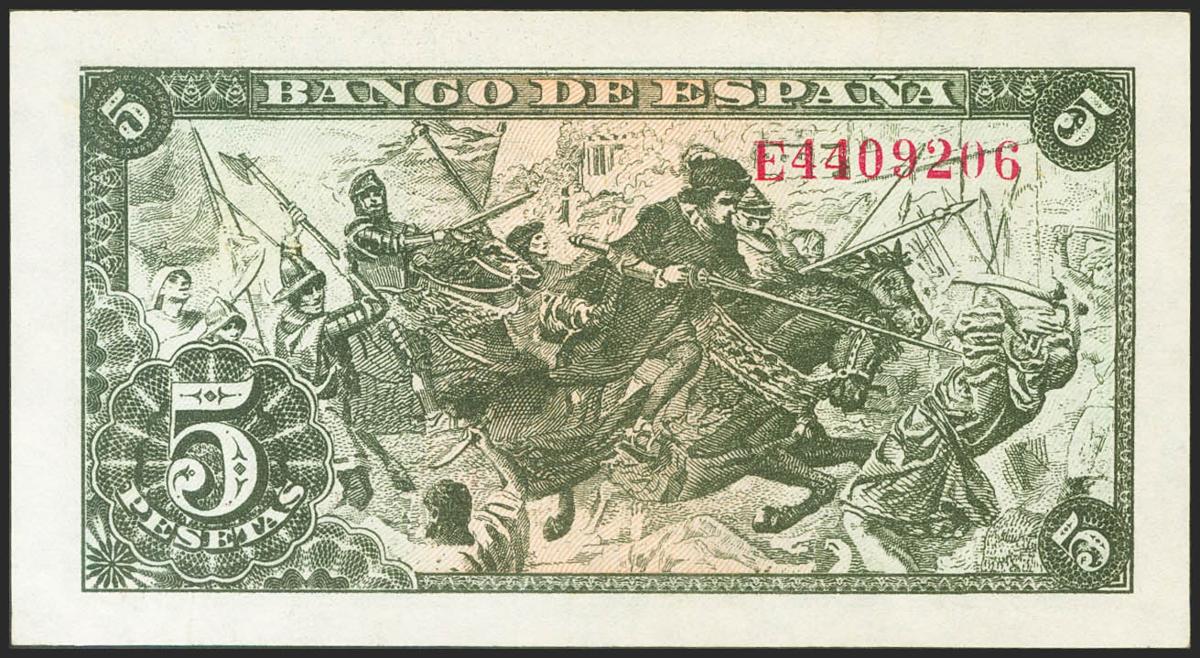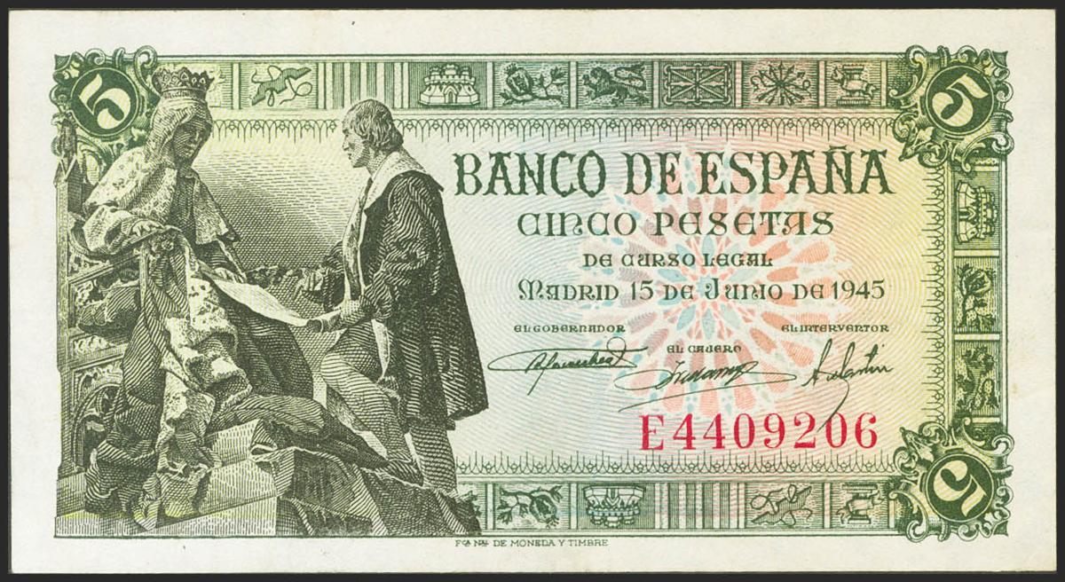 English 5 pesetas. June 15, 1945. Series E. (Edifil 2021: 449a). Original sizing. EBC++.
