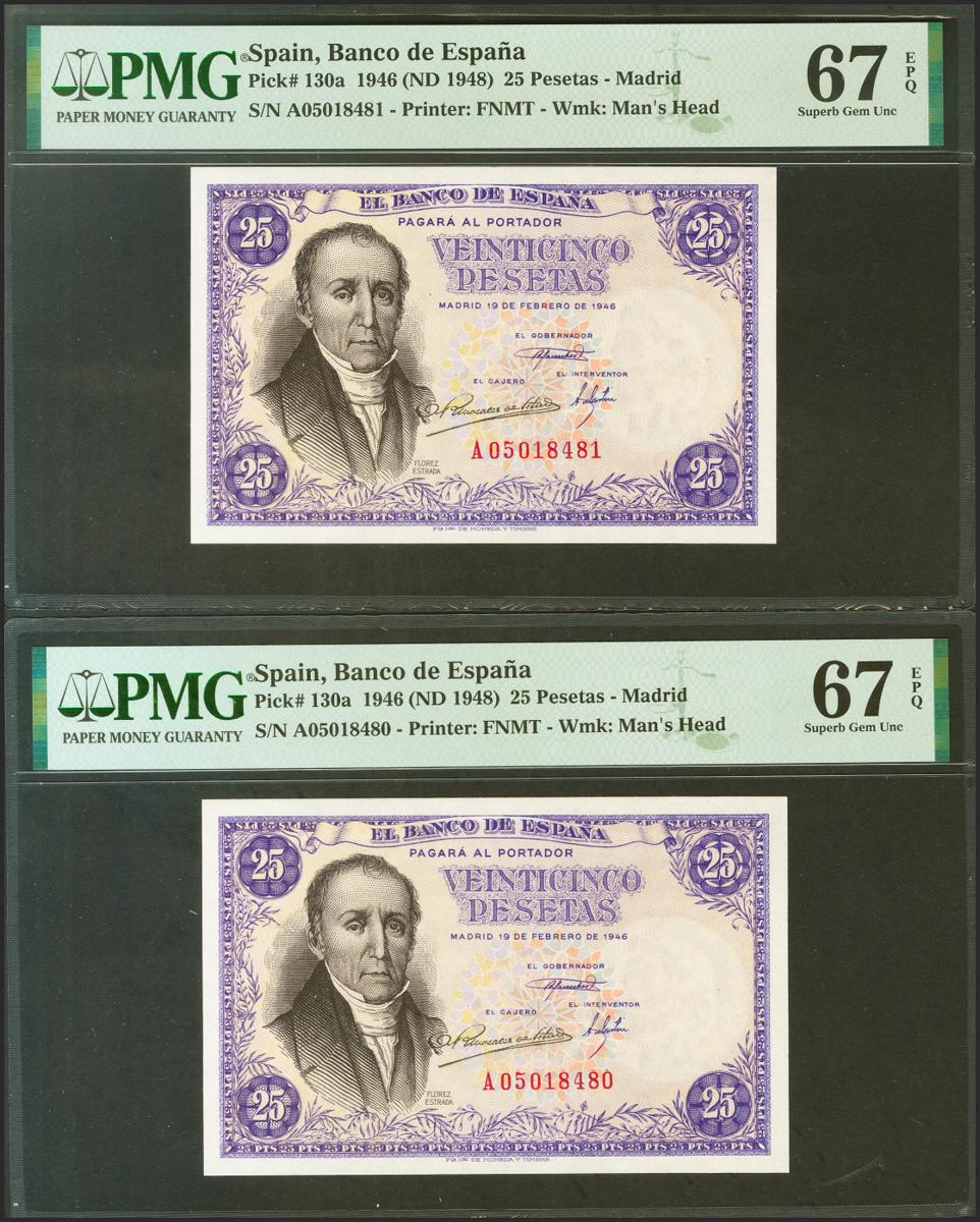 English 25 pesetas. February 20, 1946. Correlative couple. Series A. (Edifil 2021: 450a, Pick: 130a). Rare in this exceptional quality, original sizing. Uncirculated. PMG67EPQ package, both.