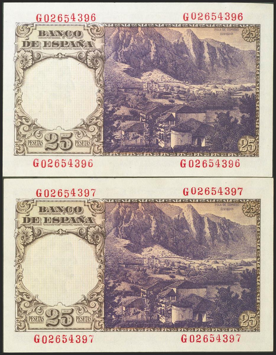 25 pesetas. February 19, 1946. Correlative pair, series G. (Edifil 2021: 450a). Original sizing. Almost Uncirculated.