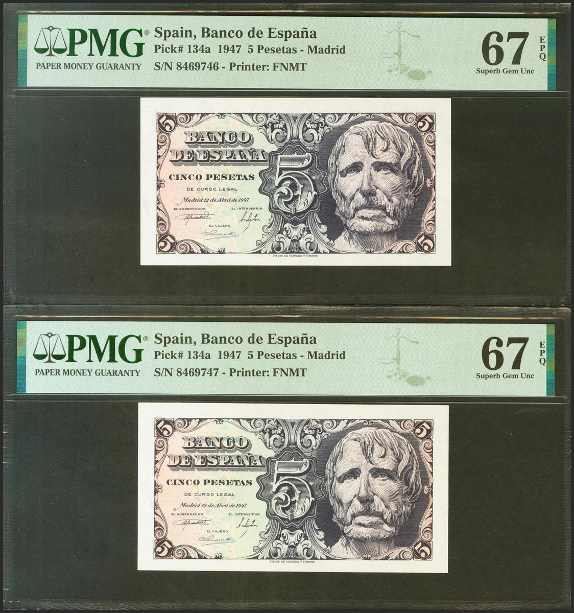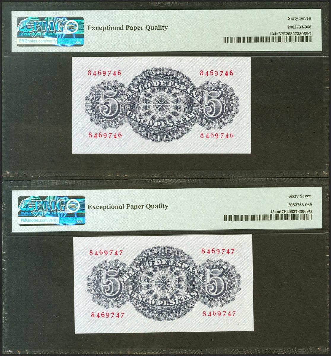 5 pesetas. April 12, 1947. Correlative couple. No serie. (Edifil 2021: 454, Pick: 134a). Rare pair in this exceptional quality, original sizing. Uncirculated. PMG67EPQ packages, both.