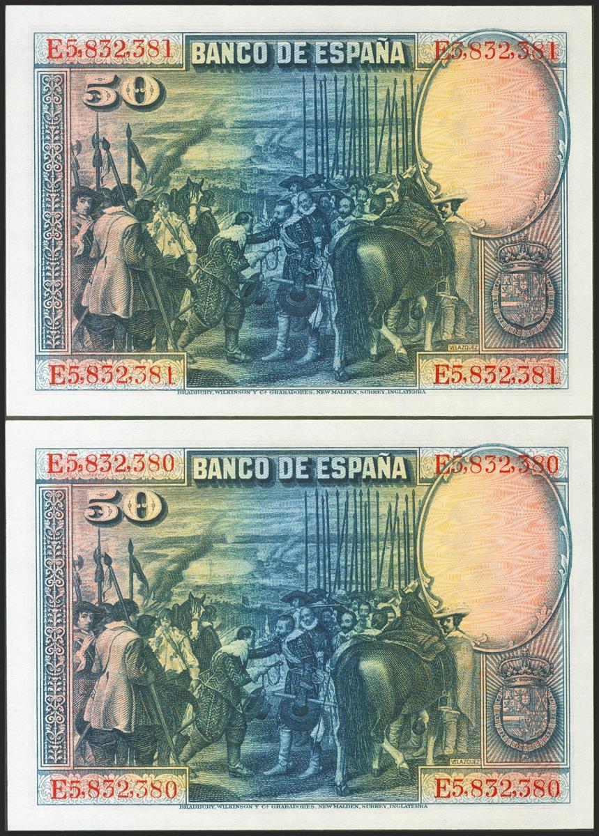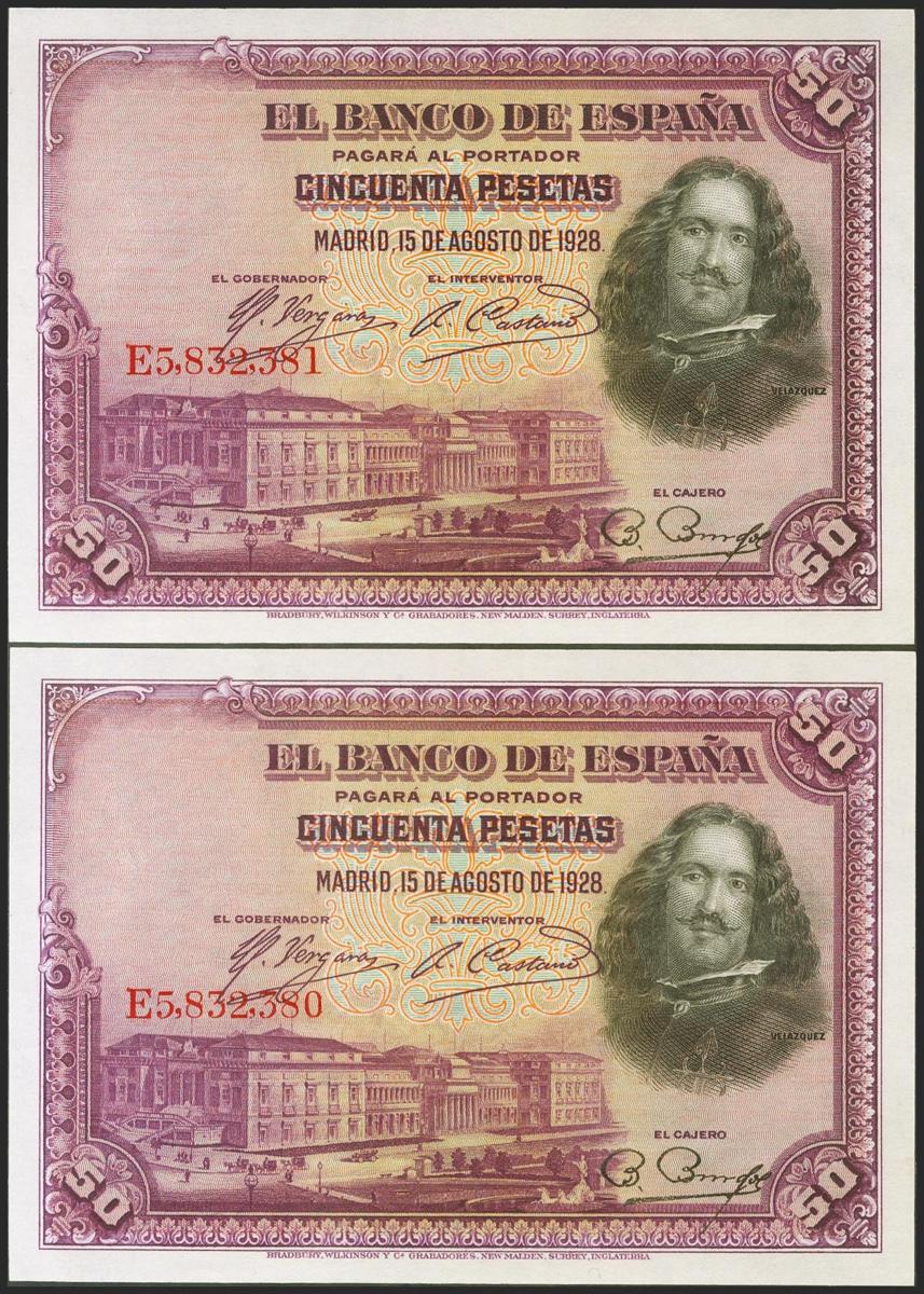 50 pesetas. August 15, 1928. Correlative couple. Series E. (Edifil 2021: 354). Original sizing. Uncirculated.