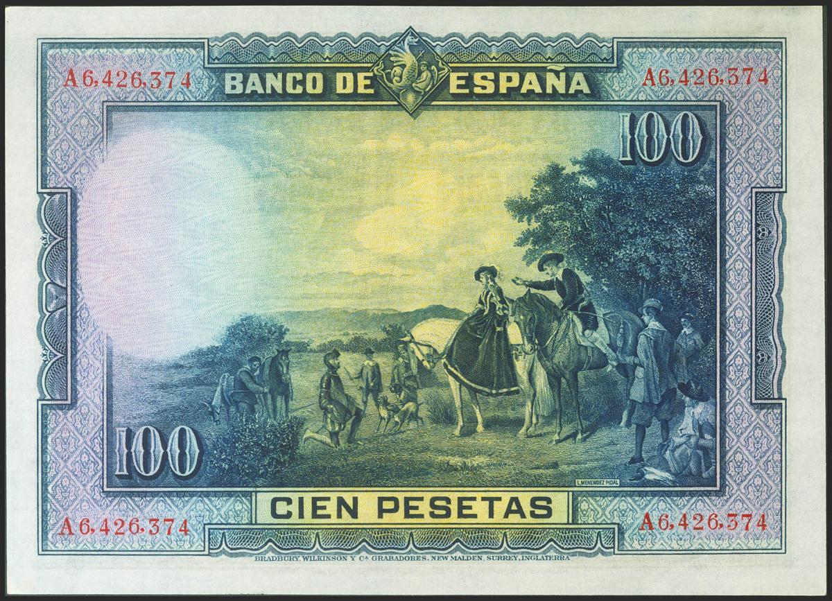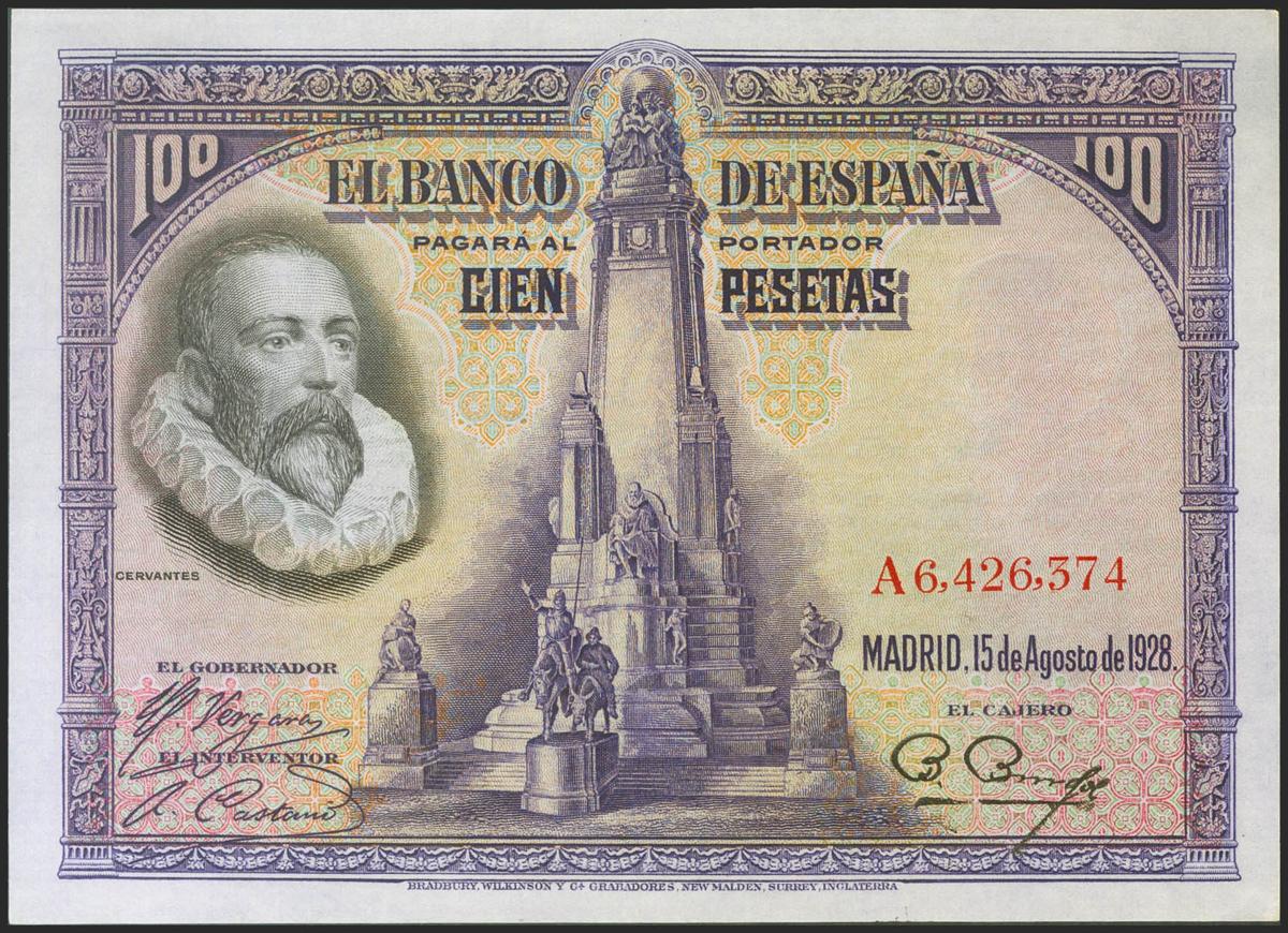 100 pesetas. August 15, 1928. Series A. (Edifil 2021: 355a). Original sizing. Uncirculated.