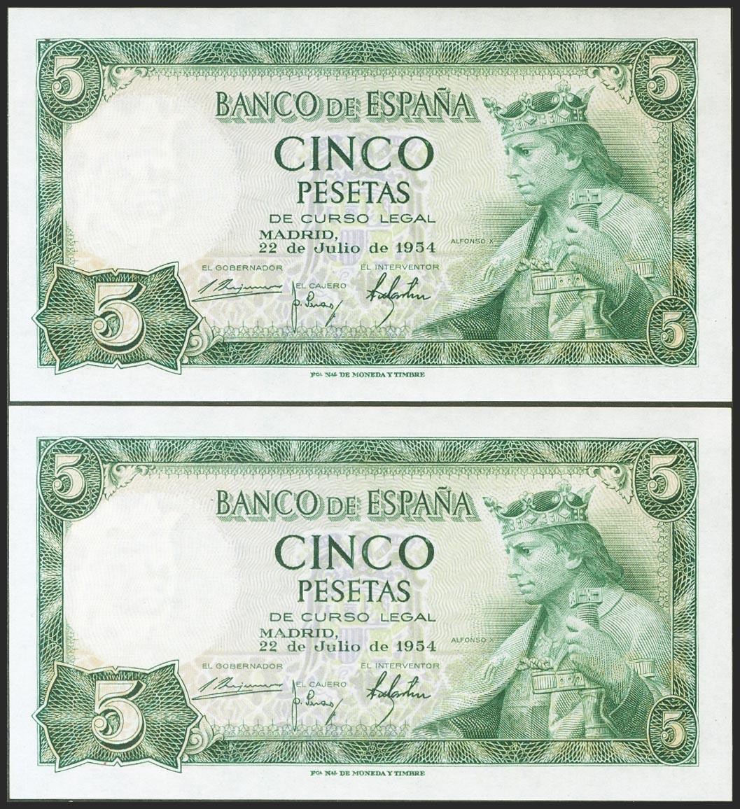 5 pesetas. July 22, 1954. Correlative couple. Series E. (Edifil 2021: 466a). Original sizing. Uncirculated.