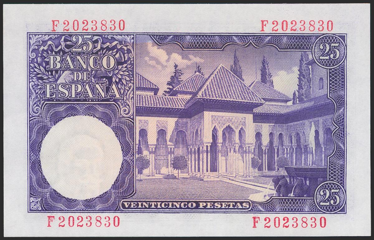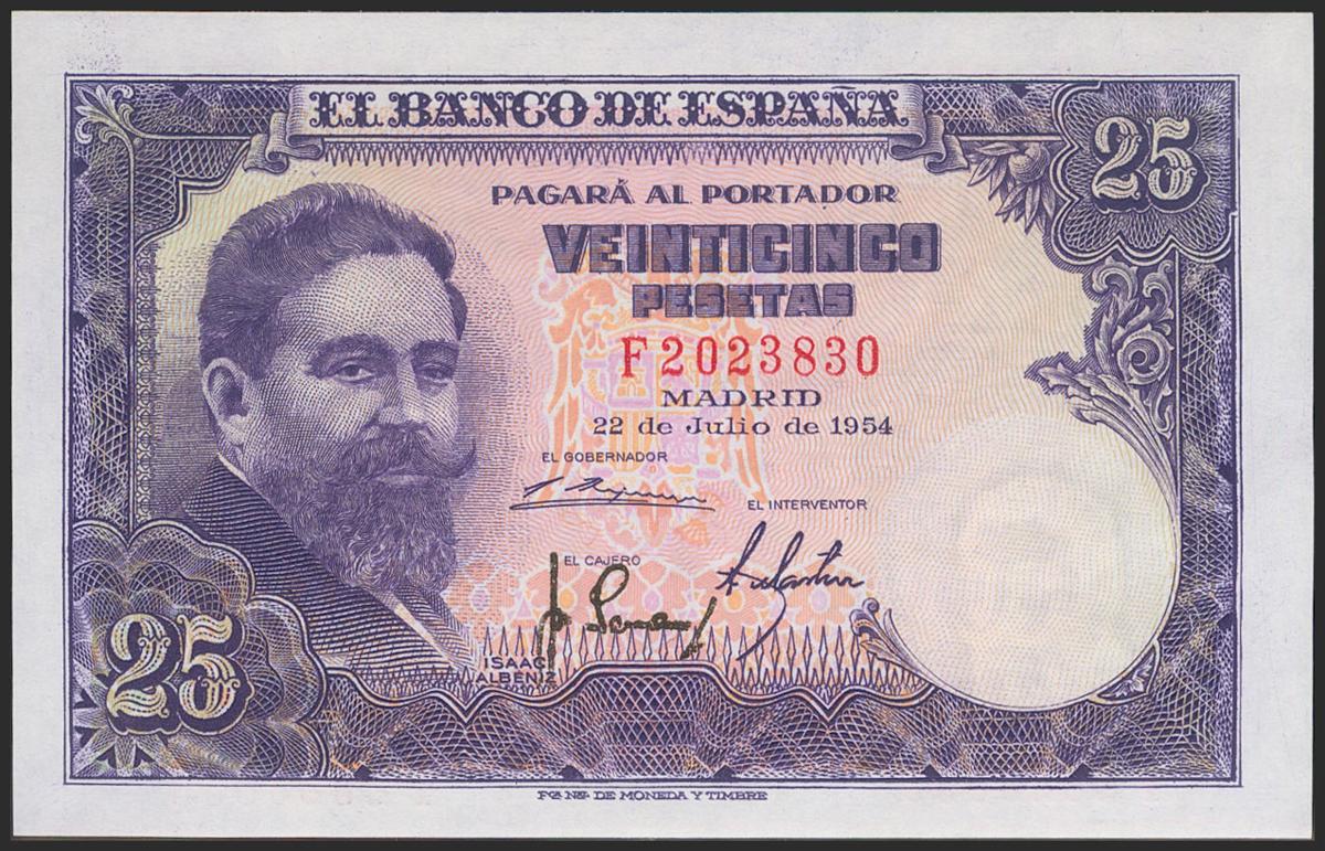 25 pesetas. July 22, 1954. Series F. (Edifil 2021: 467a). Original sizing. Uncirculated.