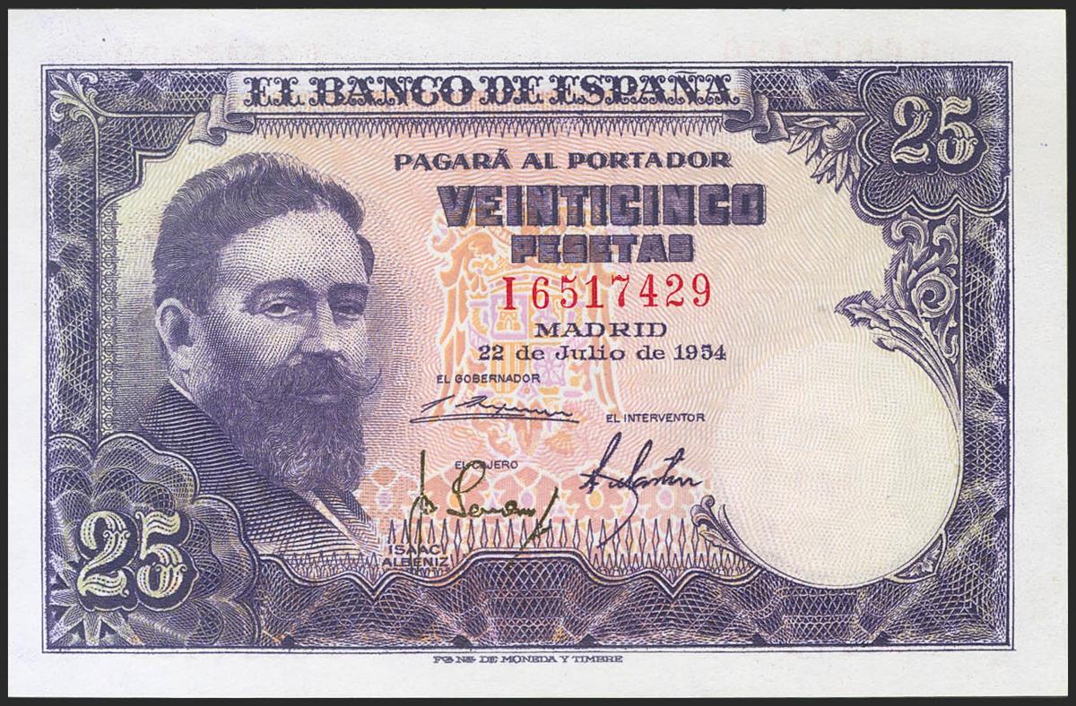 25 pesetas. July 22, 1954. Series I. (Edifil 2021: 467a). Original sizing. Almost Uncirculated.