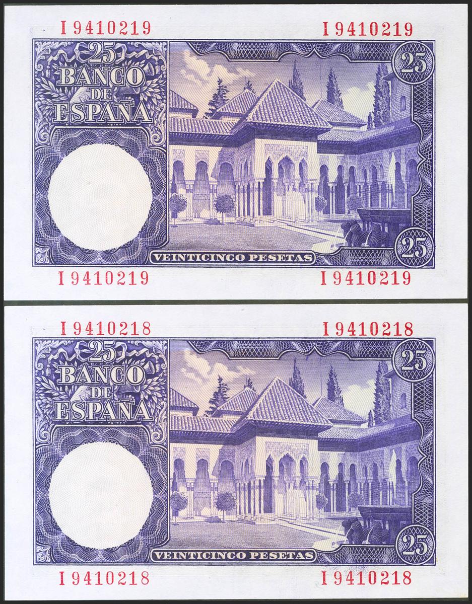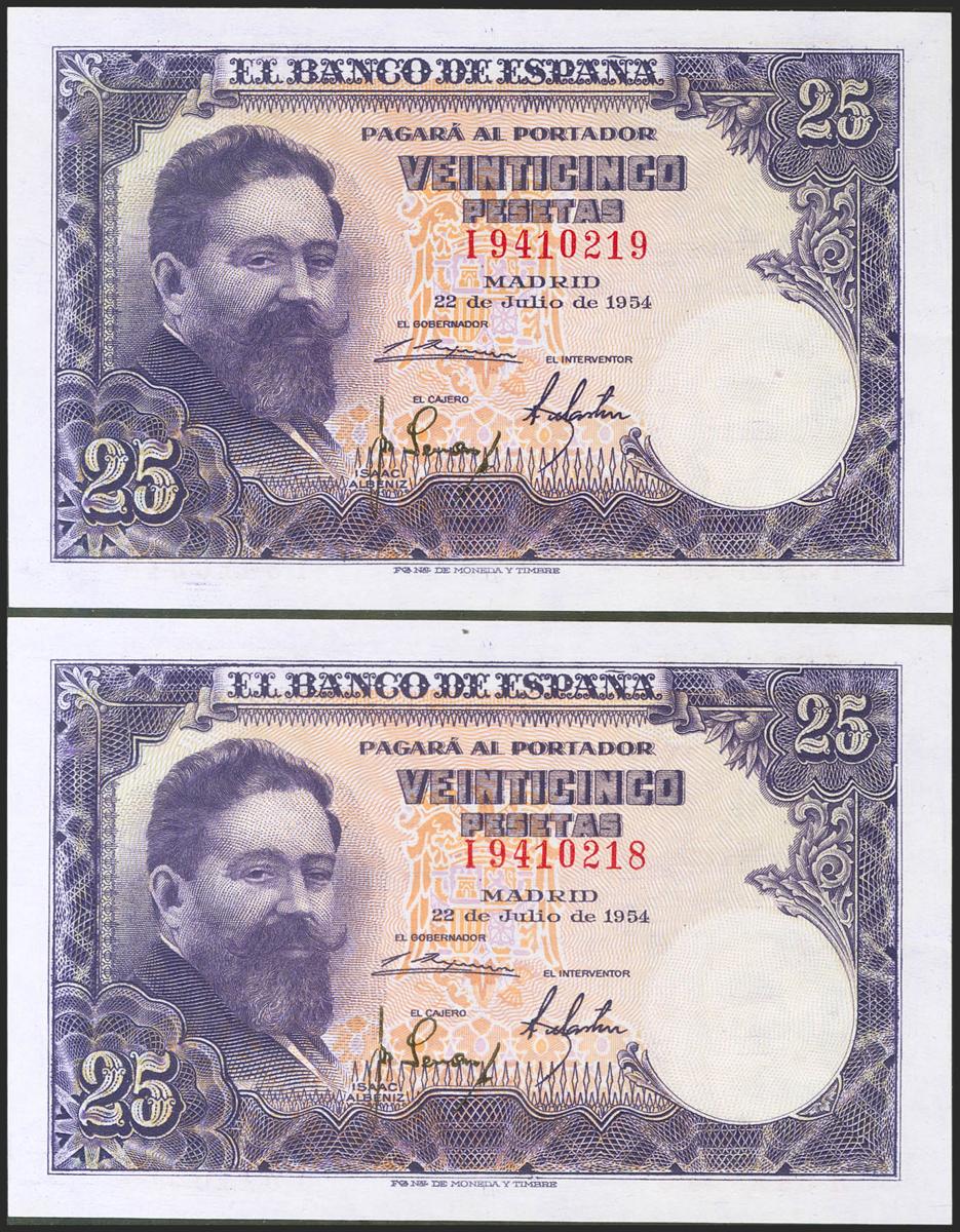 25 pesetas. July 22, 1954. Correlative couple. Series I. (Edifil 2021: 467a). Original sizing. Almost Uncirculated.