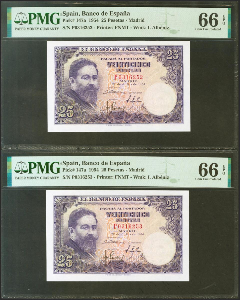 25 pesetas. July 22, 1954. Series P, last series issued. (Edifil 2021: 467b, Pick: 147a). Original sizing, pair of extraordinary rarity, especially in this exceptional quality. Uncirculated. PMG66EPQ packages, both.