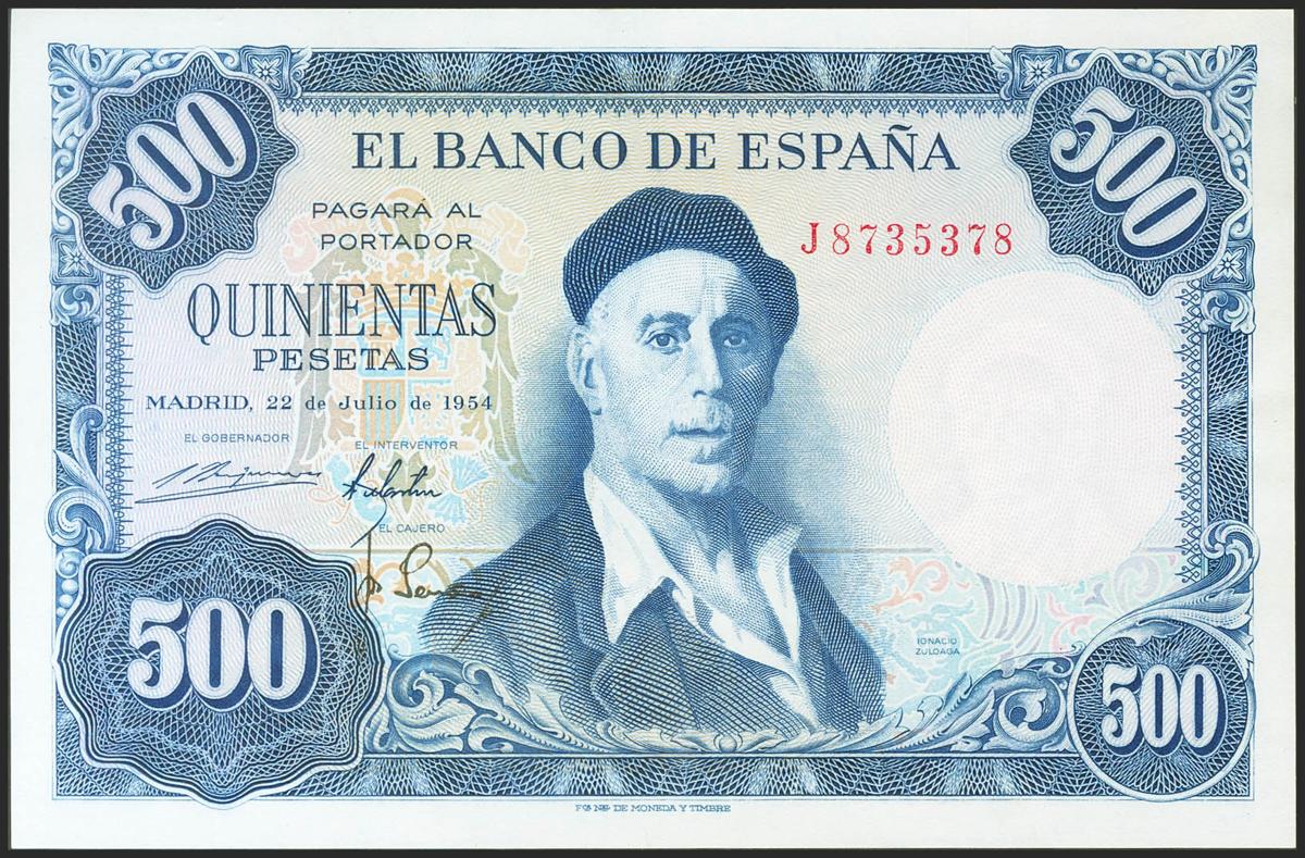 500 pesetas. July 22, 1954. Series J. (Edifil 2021: 468b). Original sizing. Uncirculated.