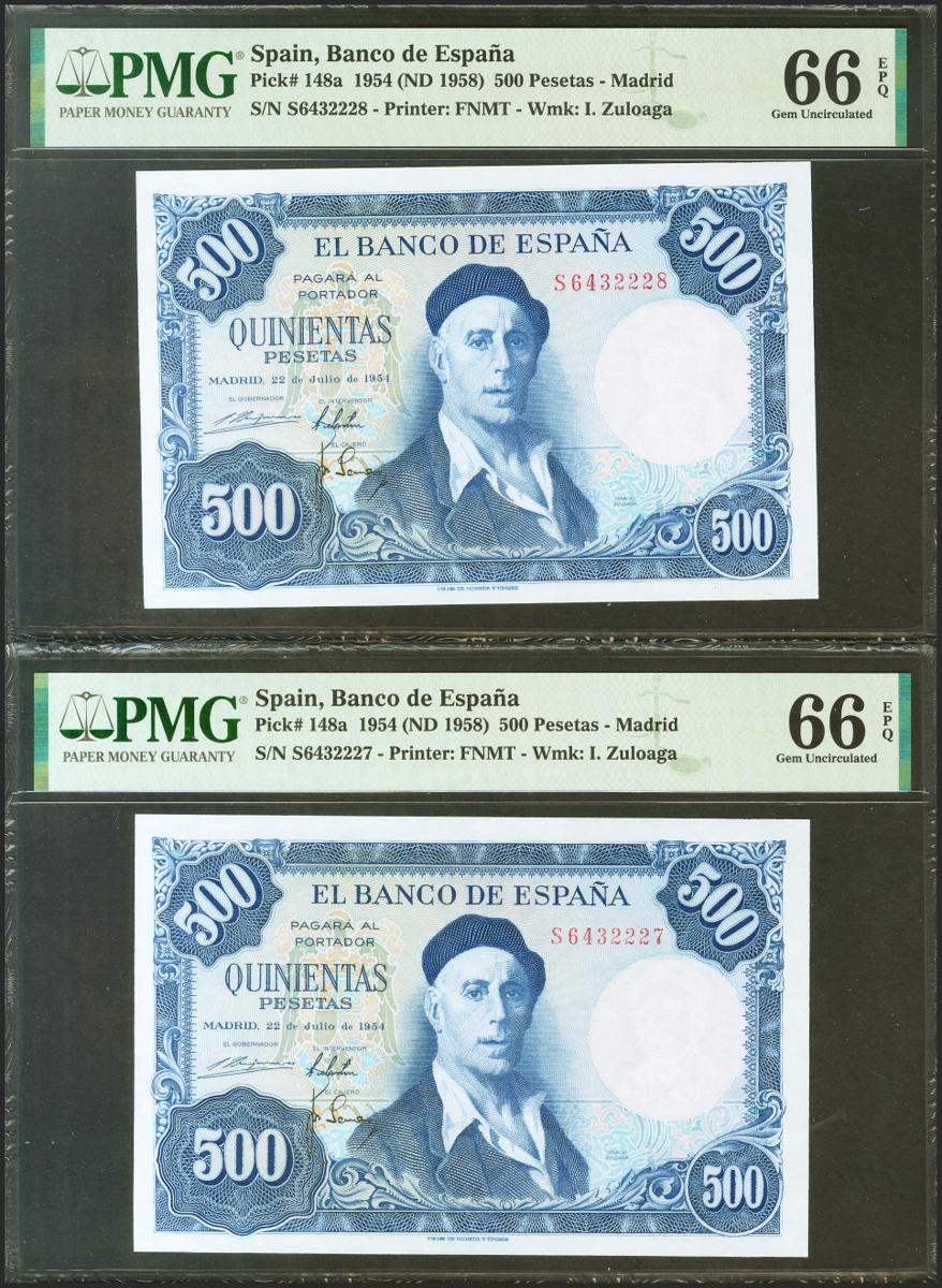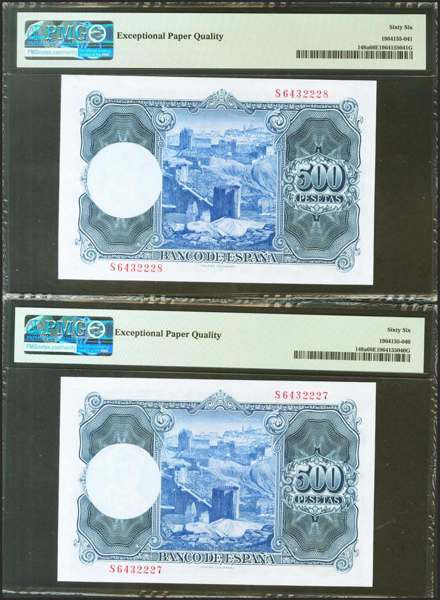 500 pesetas. July 22, 1954. Correlative couple. Series S. (Edifil 2021: 468b, Pick: 148a). Original sizing. Uncirculated. PMG66EPQ packages, both.