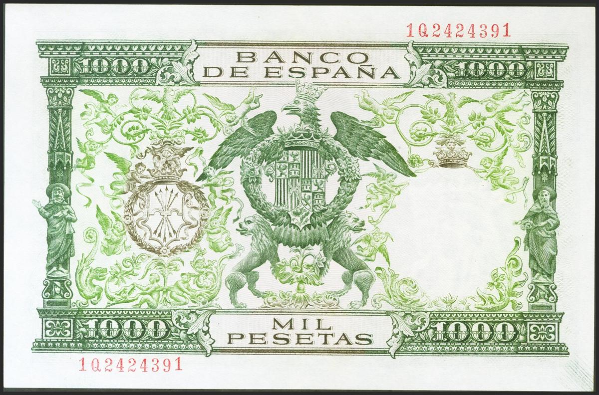 English 1000 Pesetas. November 29, 1957. Series 1Q. (Edifil 2021: 469b). It retains much of its original sizing. Good Extremely Fine.