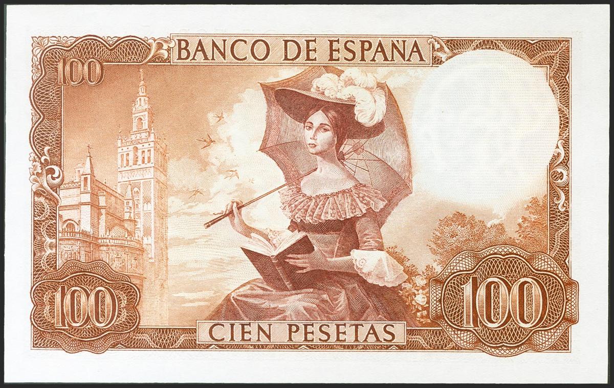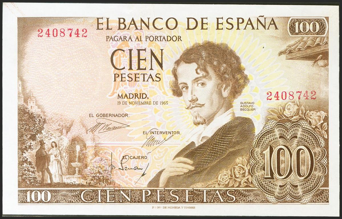 100 pesetas. November 19, 1965. No series. (Edifil 2021: 470). Retains most of the original sizing. Good Extremely Fine.