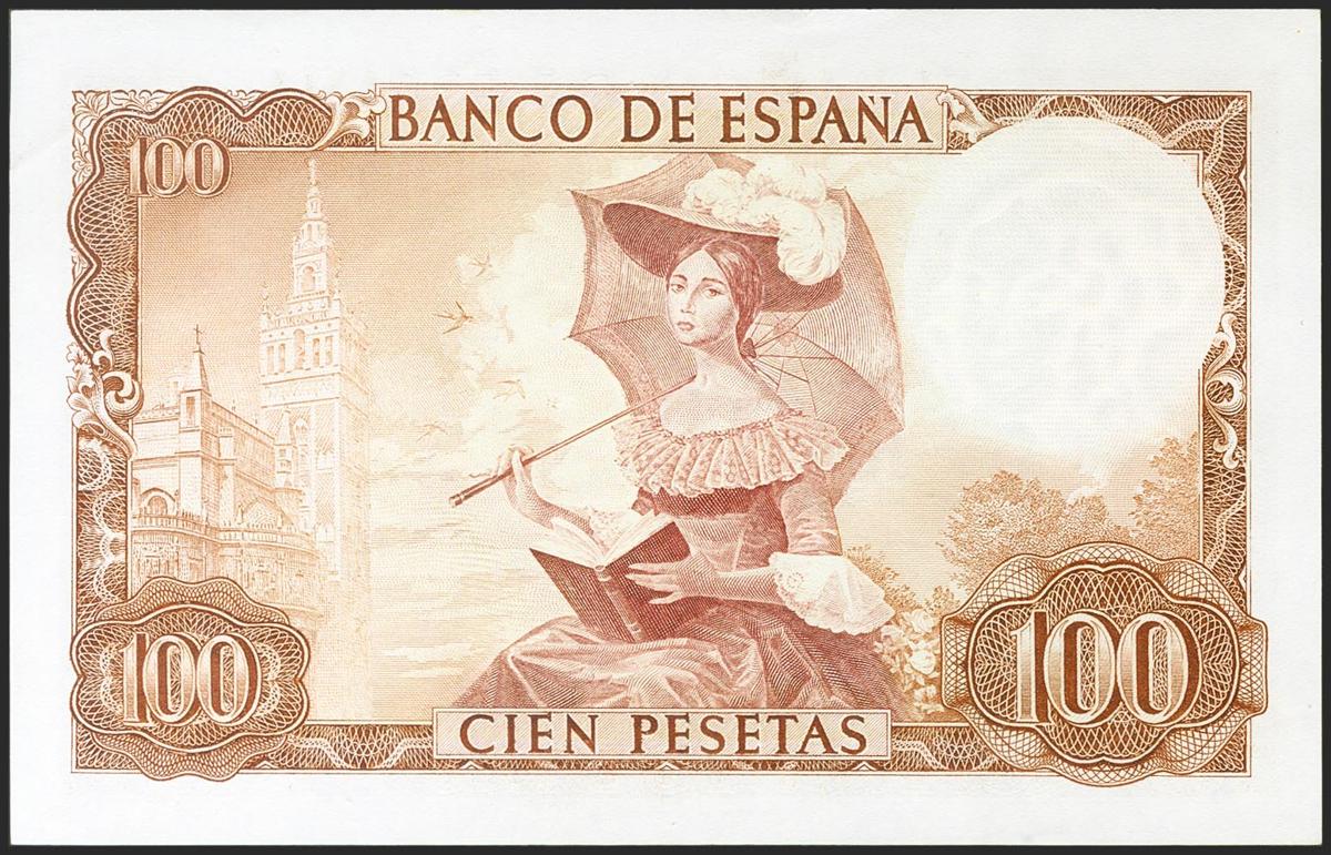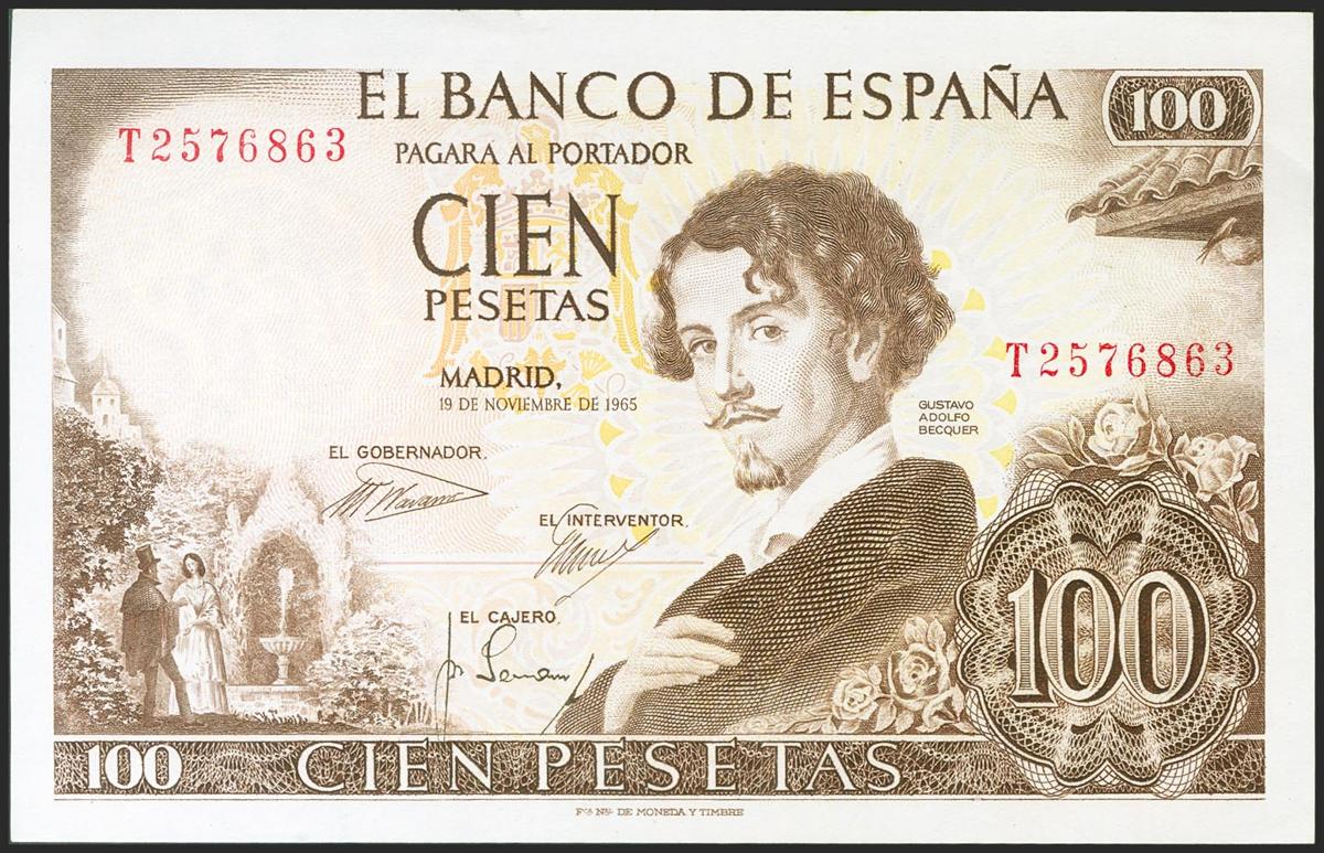 English 100 pesetas. November 19, 1965. Series T. (Edifil 2021: 470a). Original sizing. Almost Uncirculated.