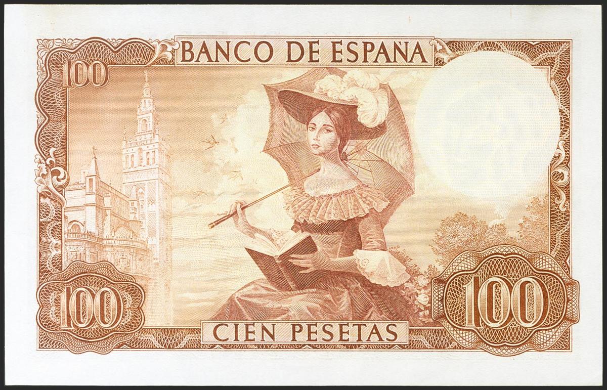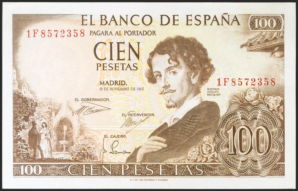 100 pesetas. November 19, 1965. Series 1F. (Edifil 2021: 470a). Original sizing. Almost Uncirculated.
