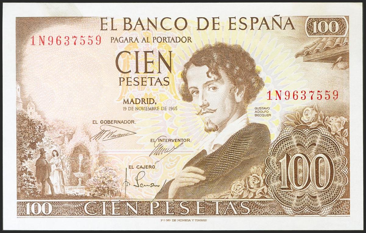 English 100 pesetas. November 19, 1965. Series 1N. (Edifil 2021: 470a). Original sizing. Almost Uncirculated.