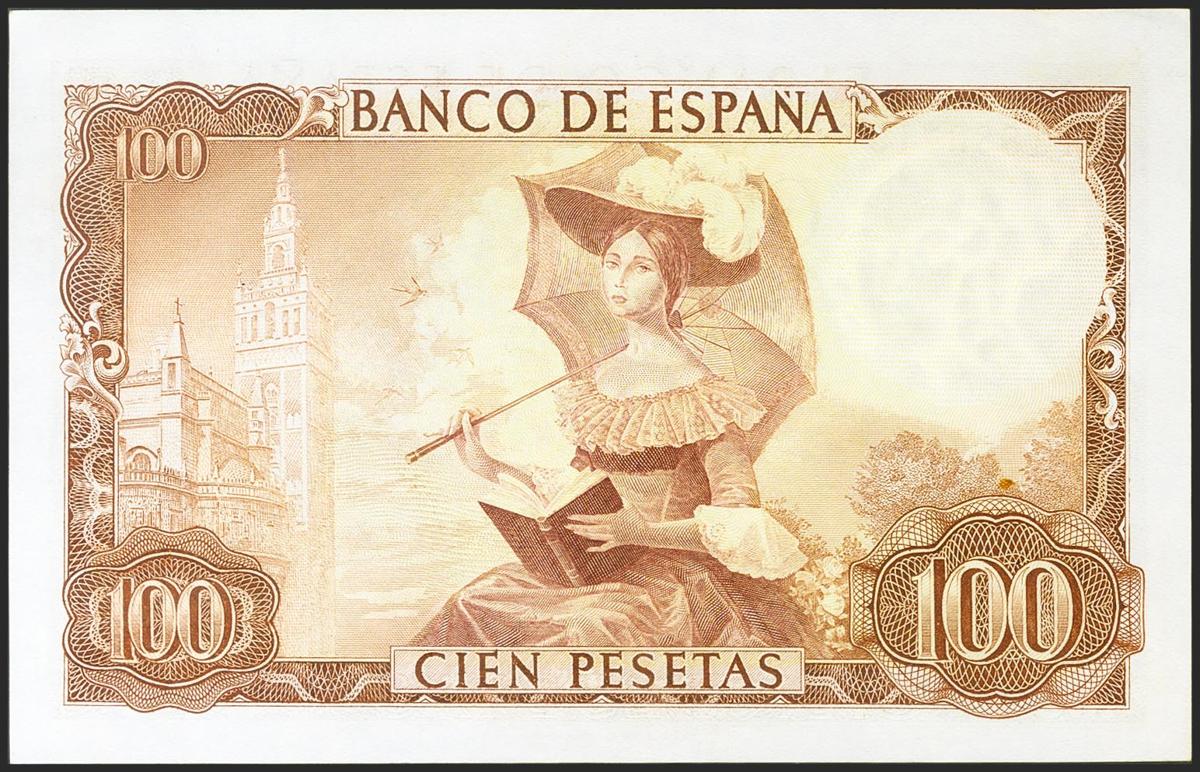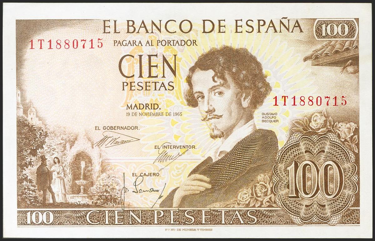 100 pesetas. November 19, 1965. Series 1T, last series issued. (Edifil 2021: 470a). Original sizing. Uncirculated.
