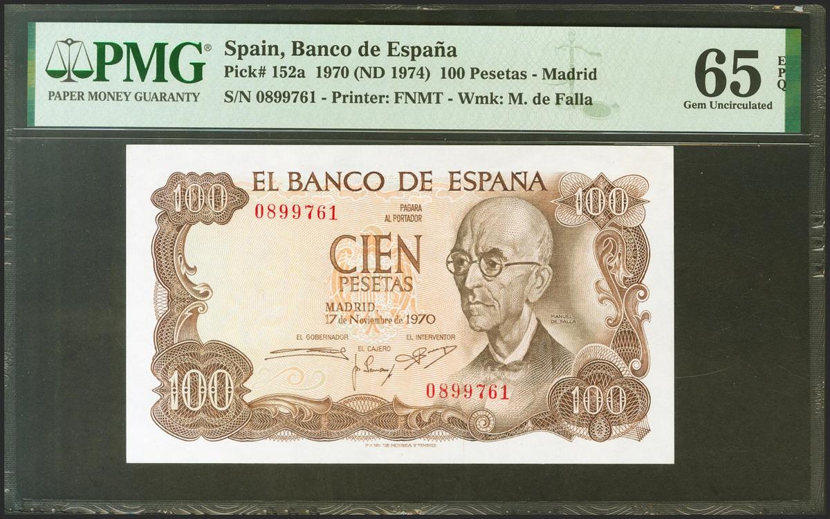 100 pesetas. November 17, 1970. No series. (Edifil 2021: 472, Pick: 152a). Original sizing. Uncirculated. PMG65EPQ package.