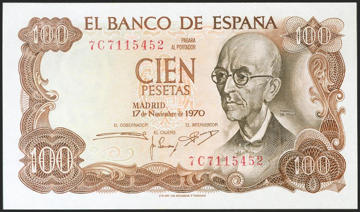 English 100 pesetas. November 17, 1970. Series 7C. (Edifil 2021: 472c). Original sizing. Uncirculated.