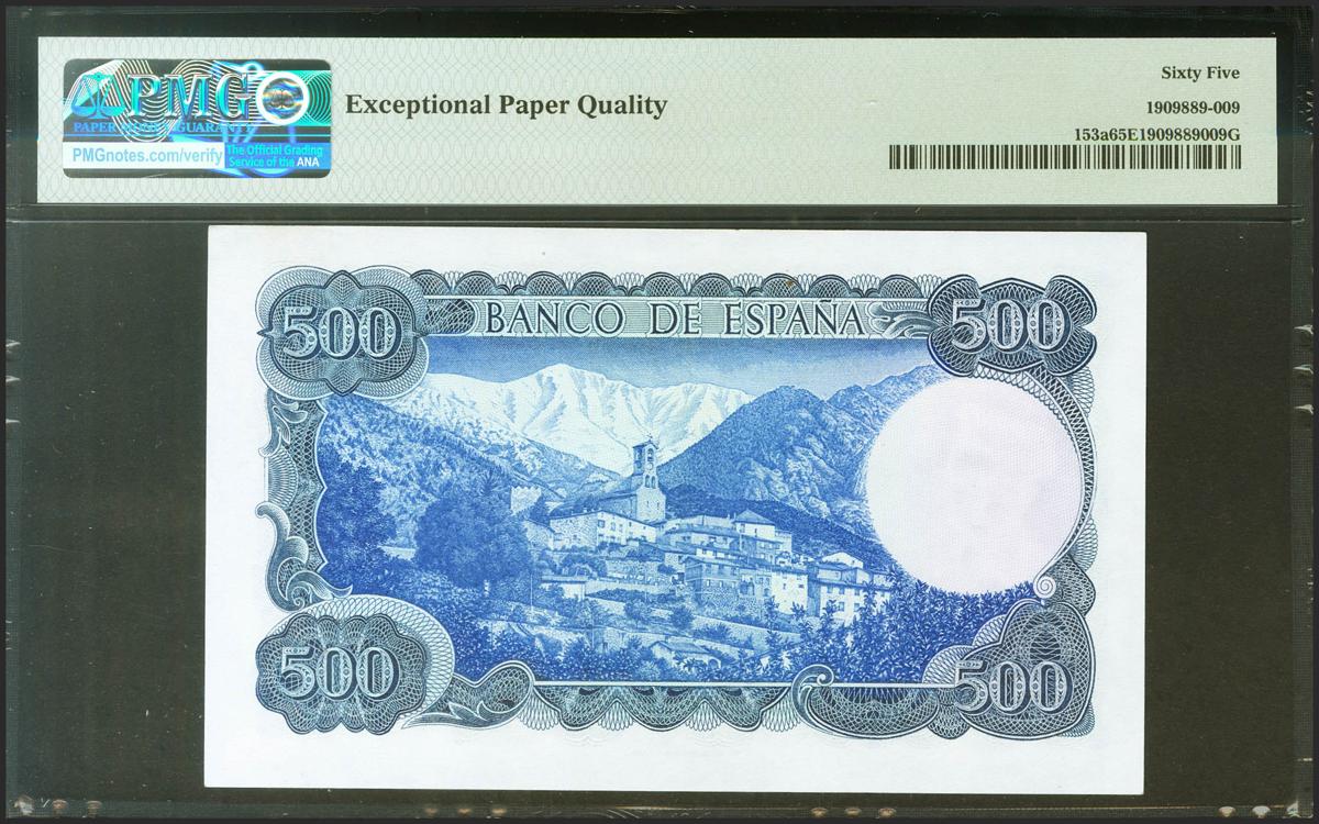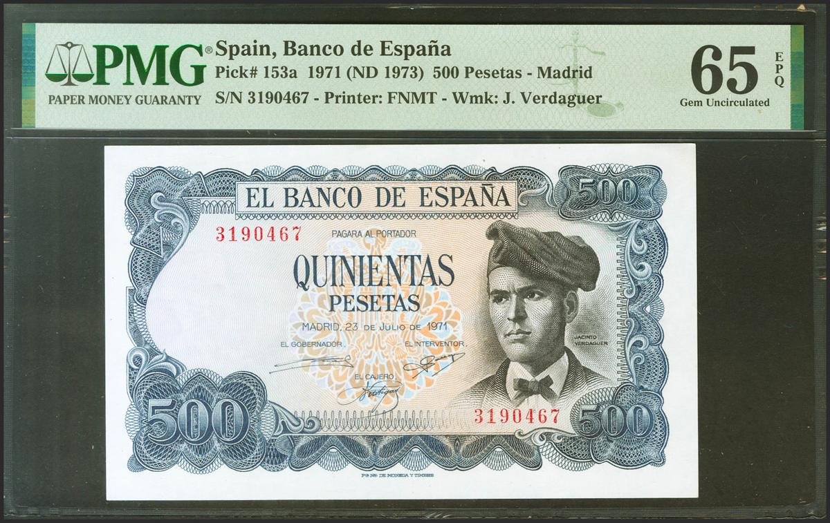 500 pesetas. July 23, 1971. No series. (Edifil 2021: 473, Pick: 153a). Rare in this quality, original sizing. Uncirculated. PMG65EPQ package.